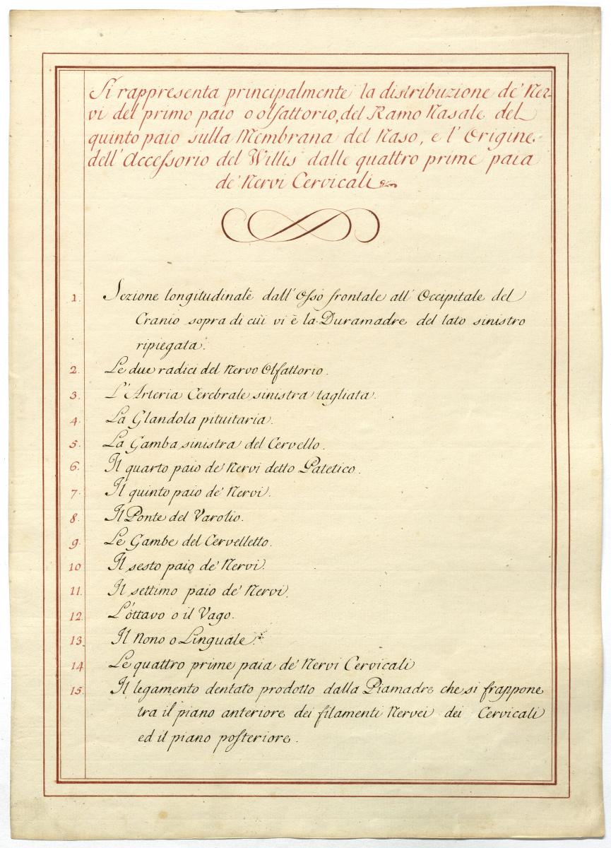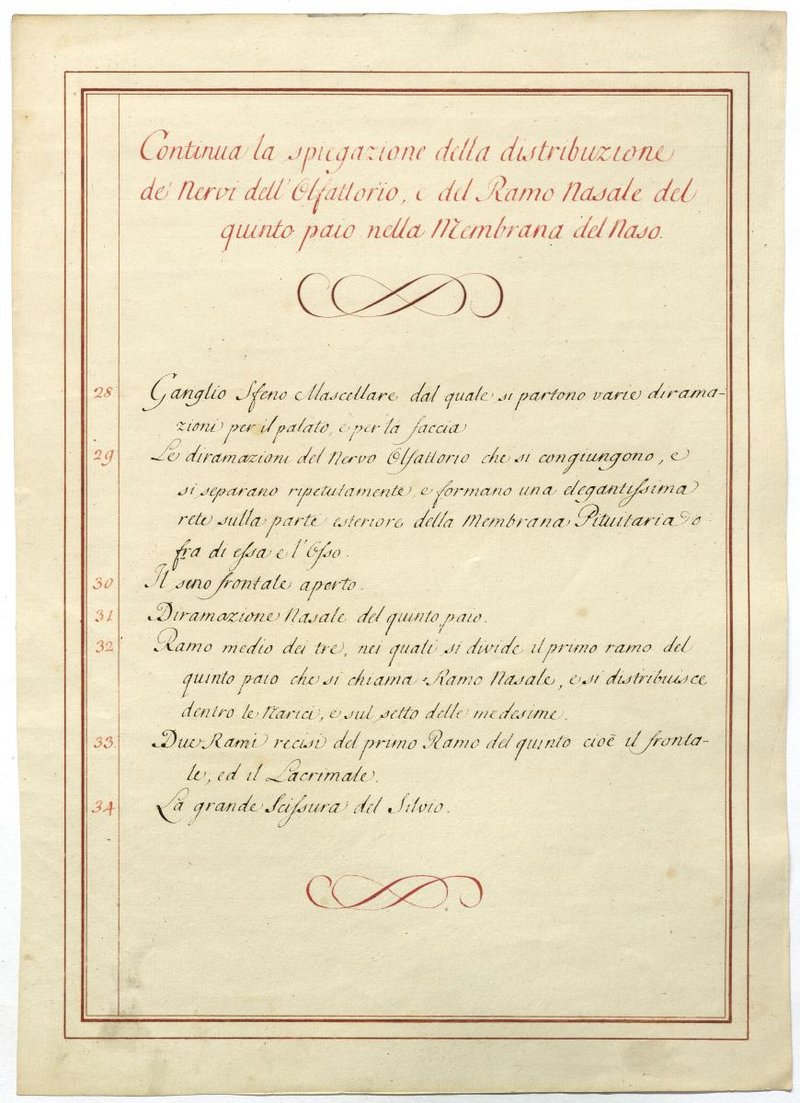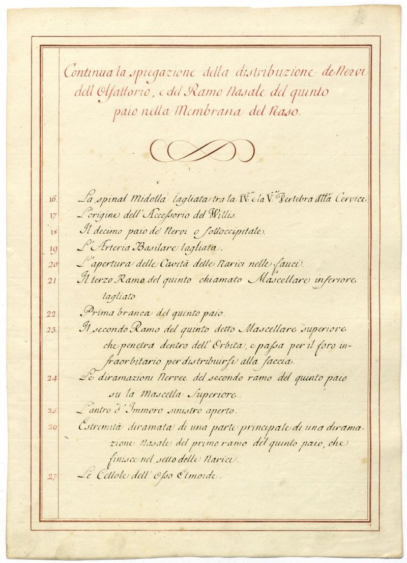 Der Text ist die ergänzende Beschreibung in italienischer Sprache zum anatomischen Wachsmodell des Riechbahn.