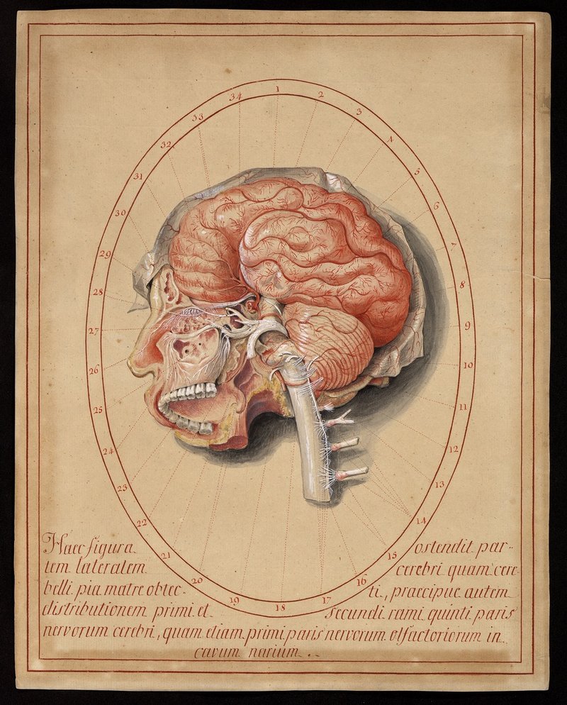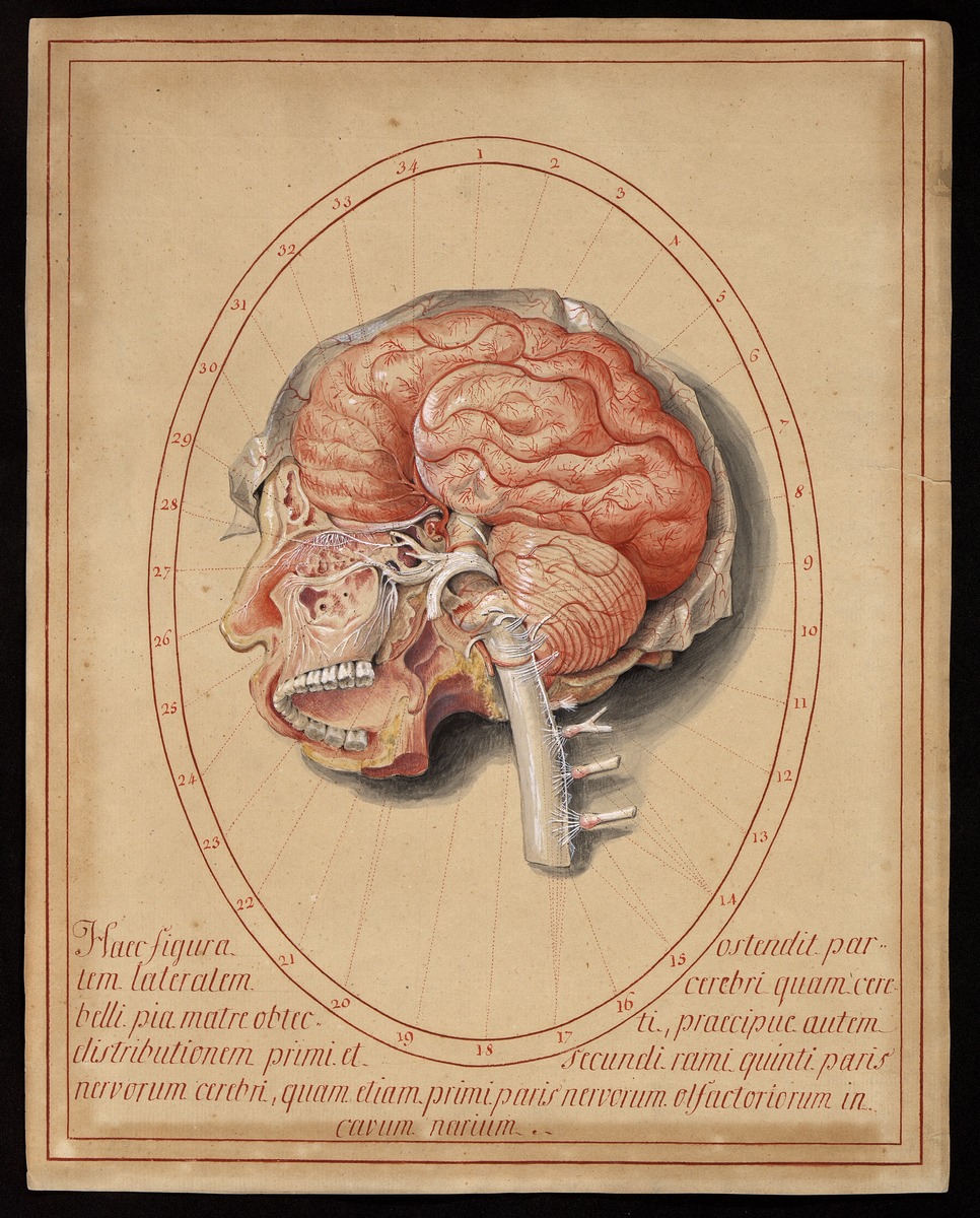Linke Seitenansicht des Groß- und Kleinhirns mit der Darstellung der Riechfäden (Nervi olfactorii) und des weiteren Verlaufes der Riechbahn (Bulbus et tractus olfactorius), der Verzweigung des 1. und 2. Astes (Nervus ophthalmicus et n. maxillaris) des 5. Hirnnerven (N. trigeminus); der 3. Ast (Nervus mandibularis) ist an seinem Abgang vom Stamm (Nervus trigeminus) durchtrennt. Weiters sind die Ursprünge der übrigen Hirn- und der ersten vier Spinalnerven dargestellt.