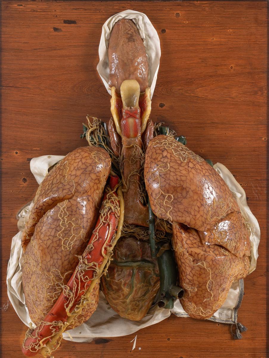 1. Hals-Thorax-Organpaket inklusive Zunge. Die Lymphgefäße der Brust- und Halsorgane, von hinten. Zur Darstellung des Herzens wurde die Hauptschlagader (Aorta) nach links verdrängt. Die Lymphgefäße sind überzeichnet dargestellt, parallel zur Aorta sieht man den Hauptlymphgang (Ductus thoracicus).