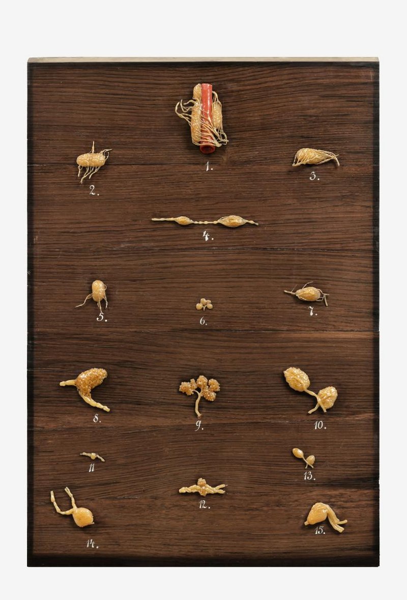 1. Ein Stück der Hüftschlagader (Arteria iliaca communis) mit Lymphknoten (Nodi lymphatici) und Lymphgefäßen (Vasa lymphatica). 2. bis 15. Mit verschiedenen Methoden präparierte Lymphknoten (Nodi lymphatici) und Lymphgefäße (Vasa lymphatica) und deren unterschiedliche Ausprägungsformen, vergrößert.