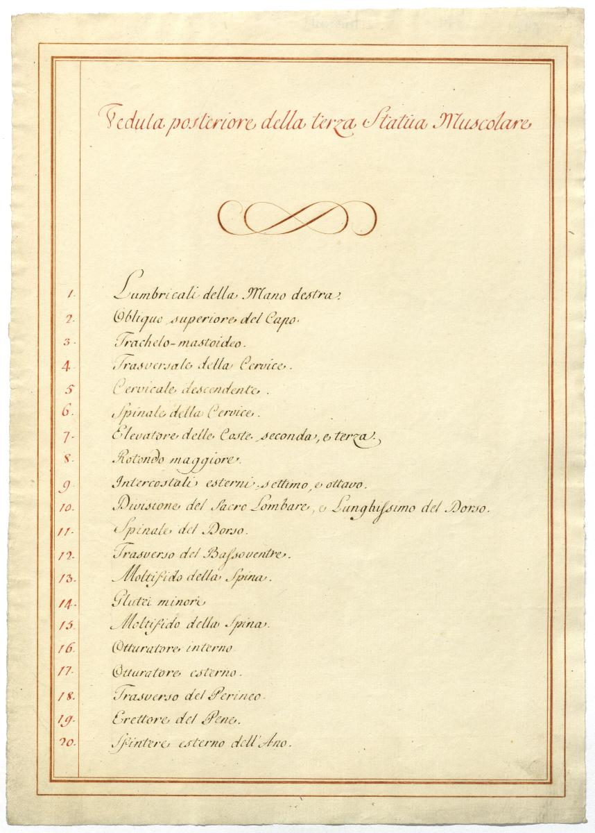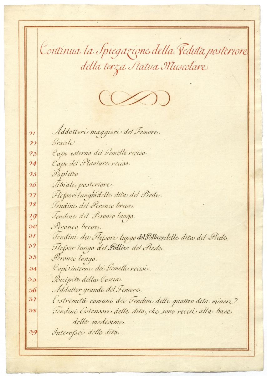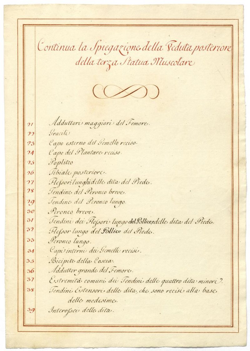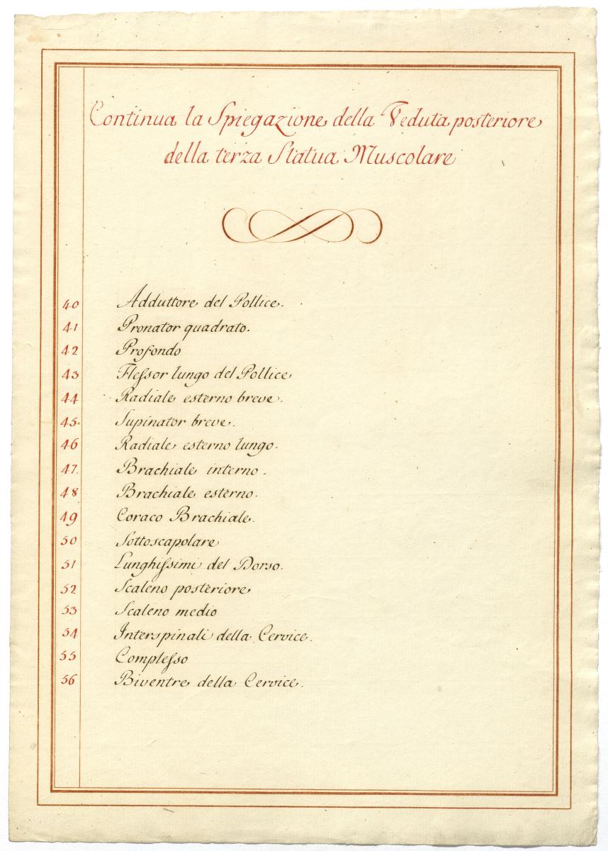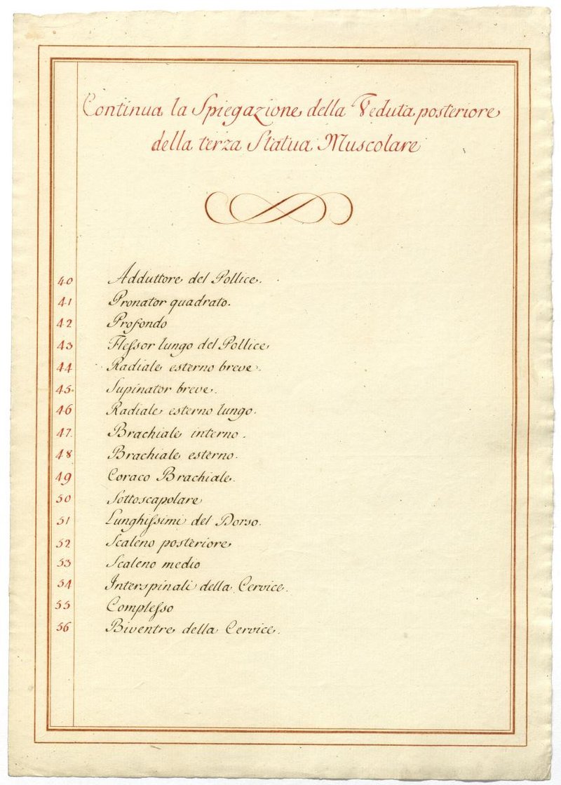 Der Text ist die ergänzende Beschreibung in italienischer Sprache zum anatomischen Wachsmodell der tieferen Muskelschicht.