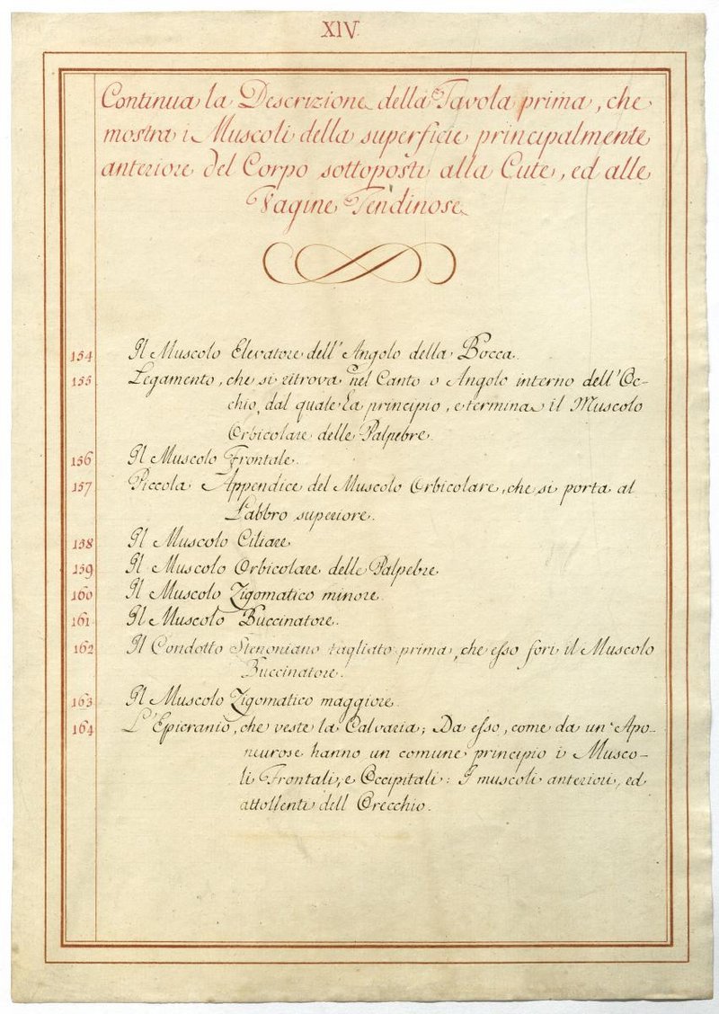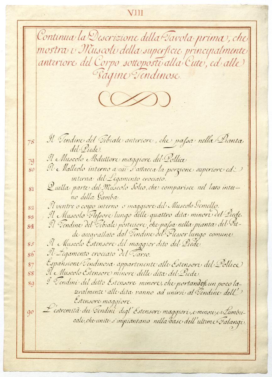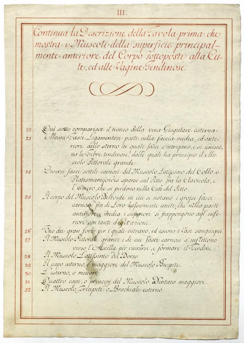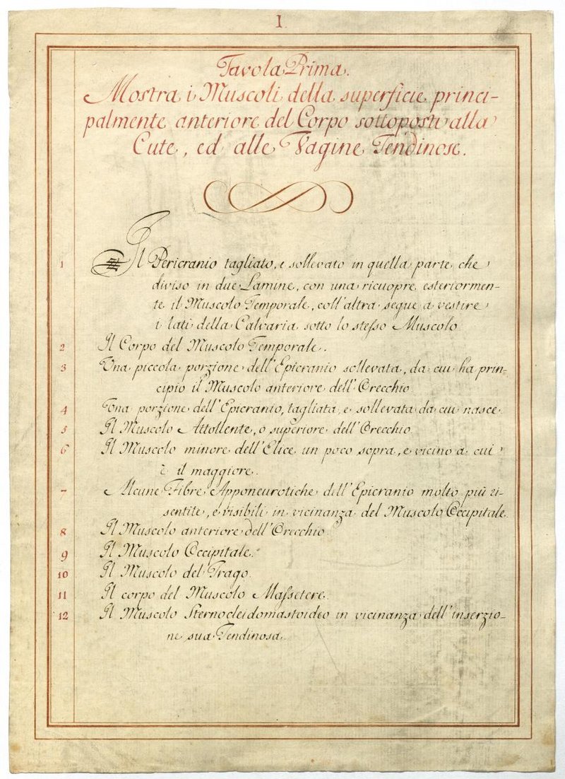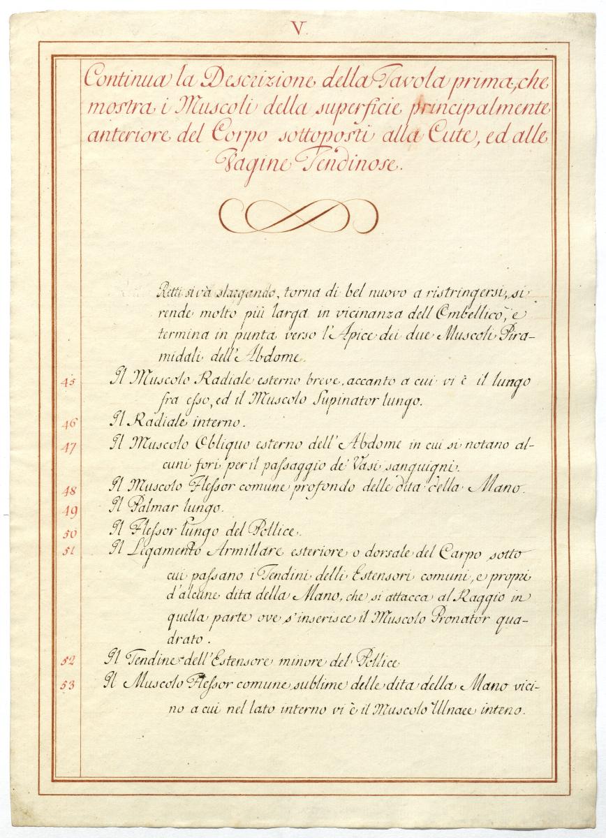 Der Text ist die ergänzende Beschreibung in italienischer Sprache zum anatomischen Wachsmodell der oberflächliche Muskelschicht.
