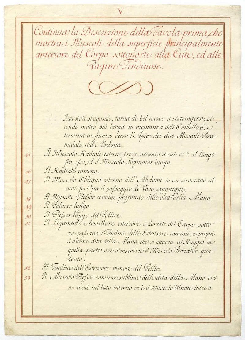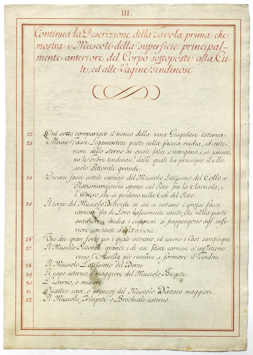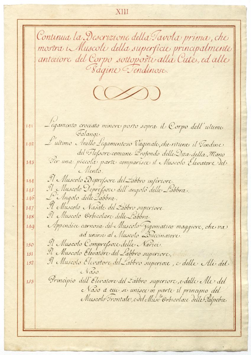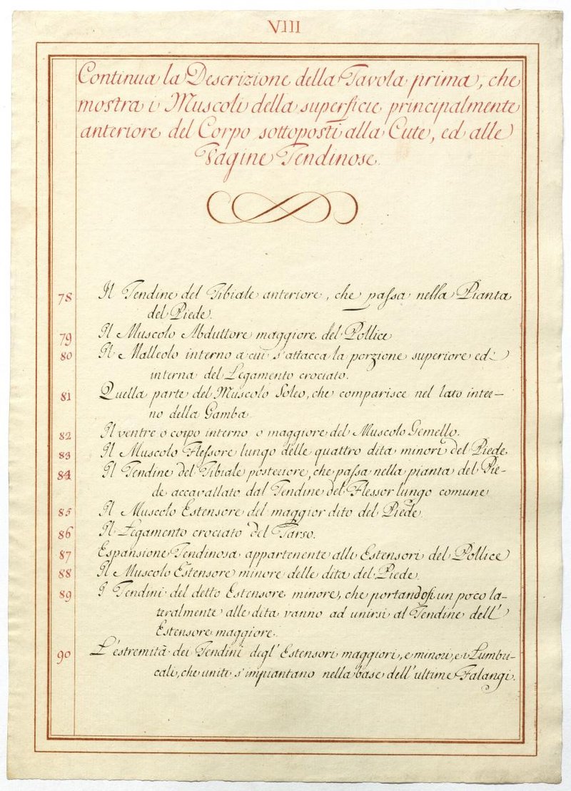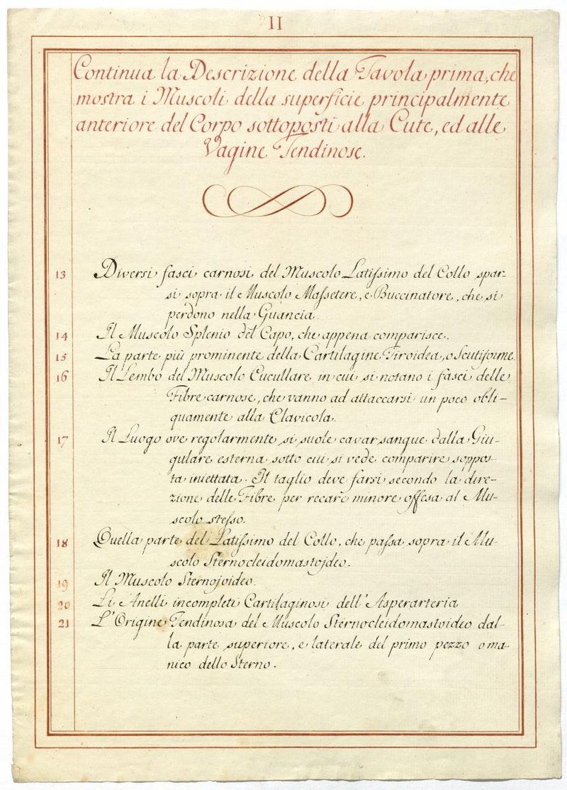 Der Text ist die ergänzende Beschreibung in italienischer Sprache zum anatomischen Wachsmodell der oberflächliche Muskelschicht.