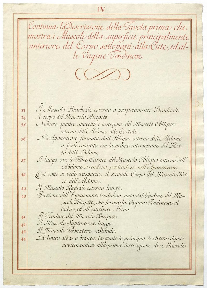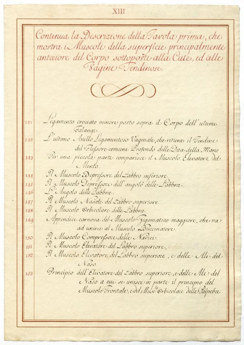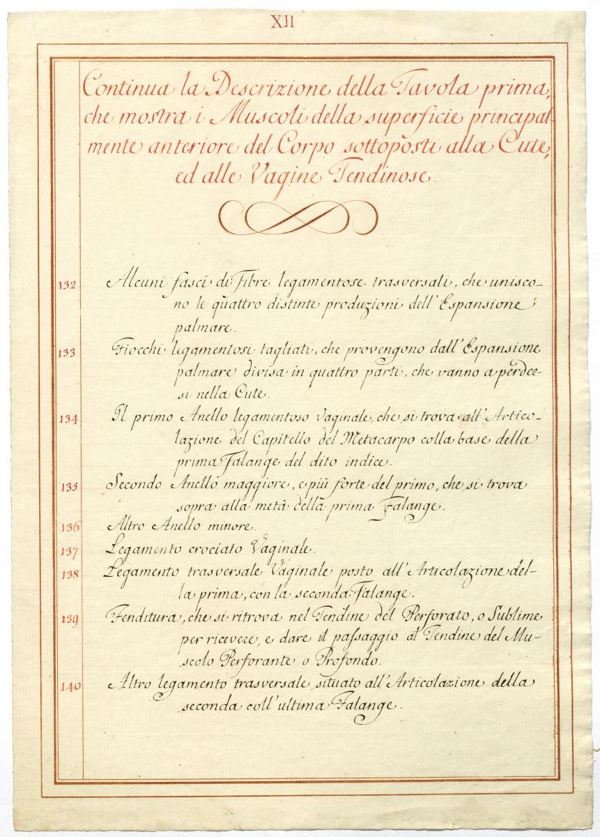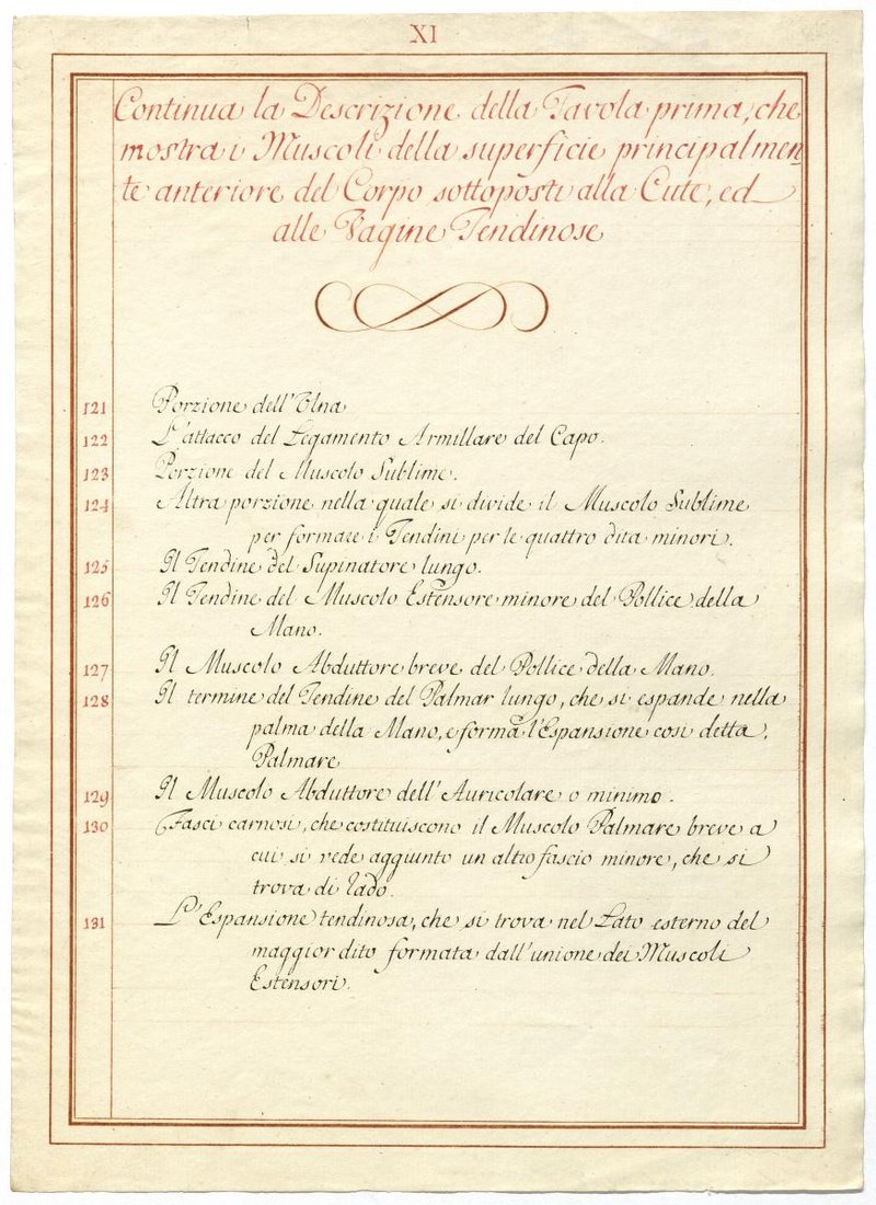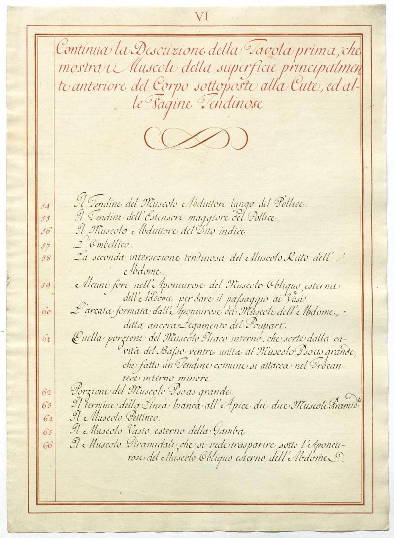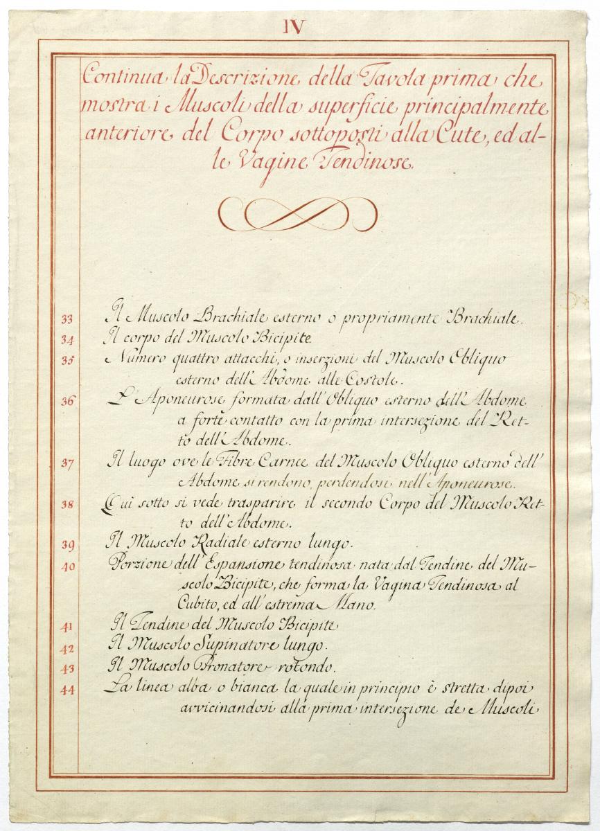 Der Text ist die ergänzende Beschreibung in italienischer Sprache zum anatomischen Wachsmodell der oberflächliche Muskelschicht.