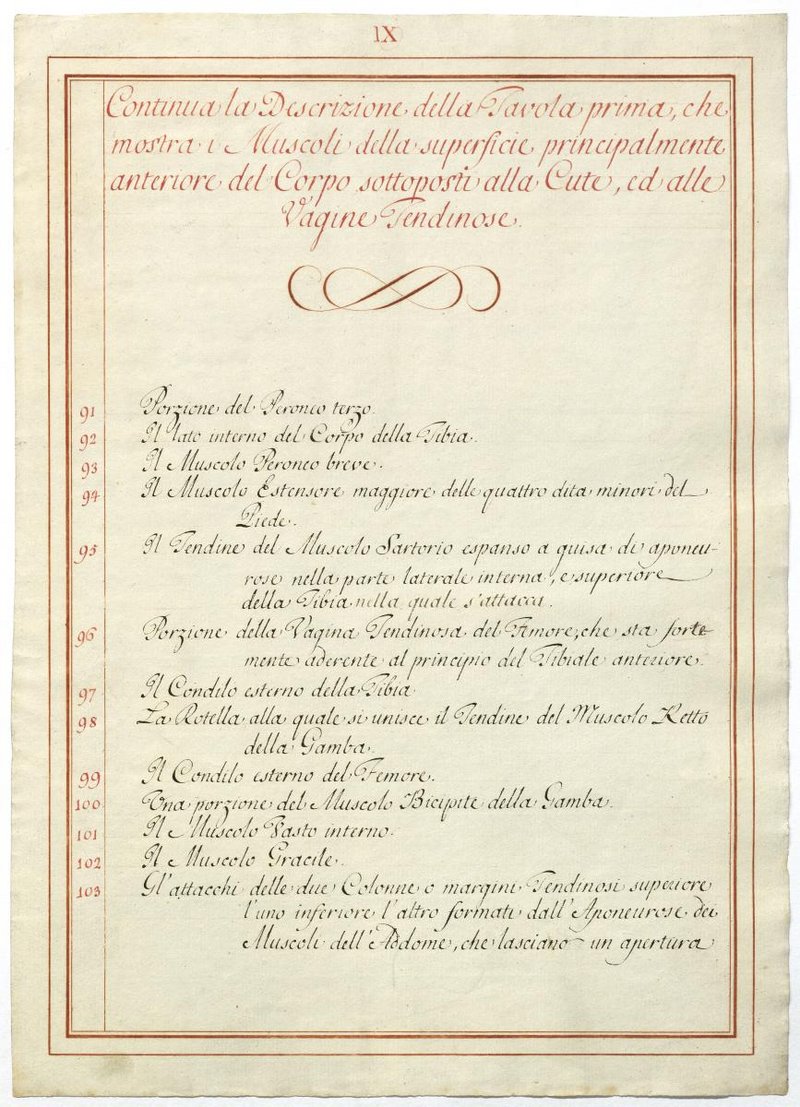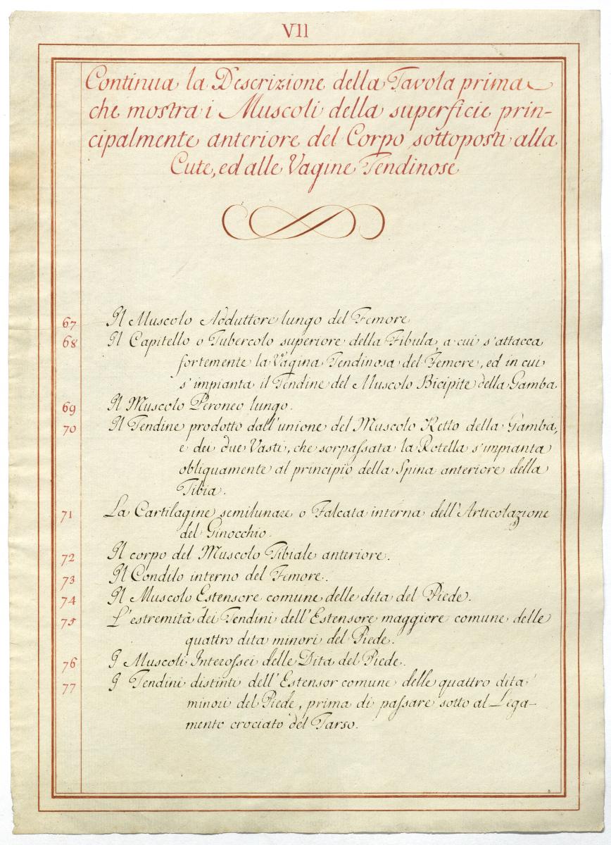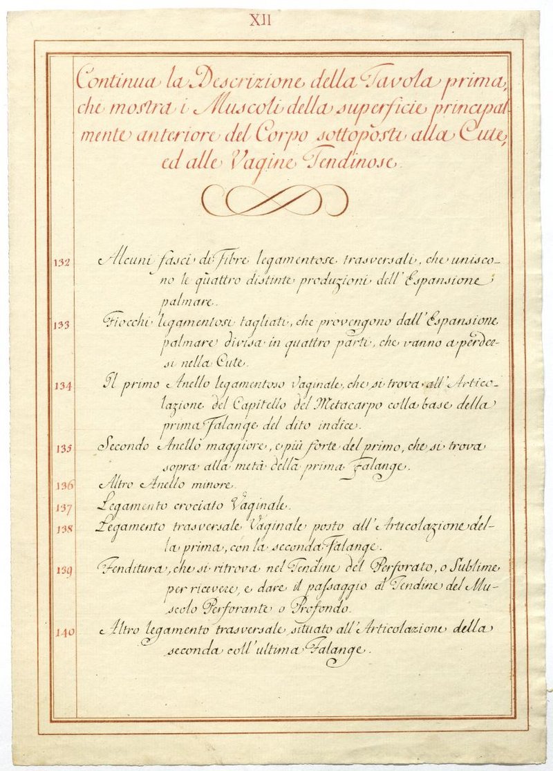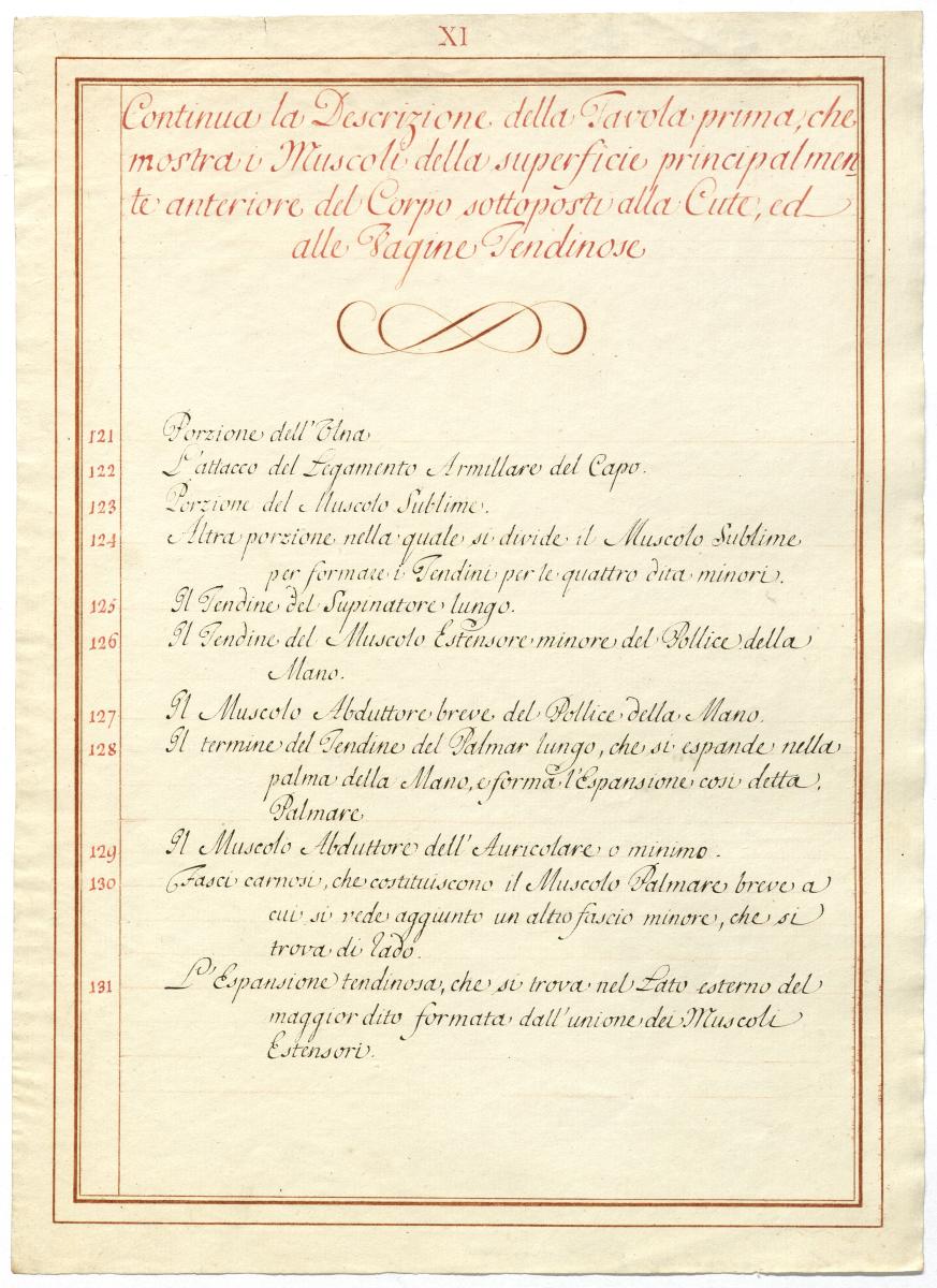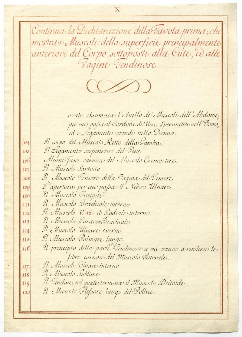 Der Text ist die ergänzende Beschreibung in italienischer Sprache zum anatomischen Wachsmodell der oberflächliche Muskelschicht.