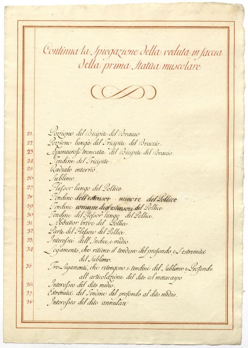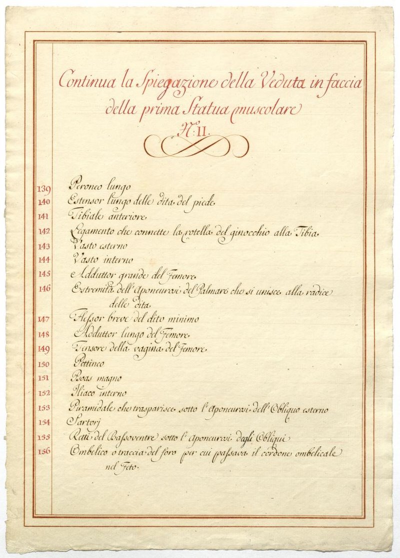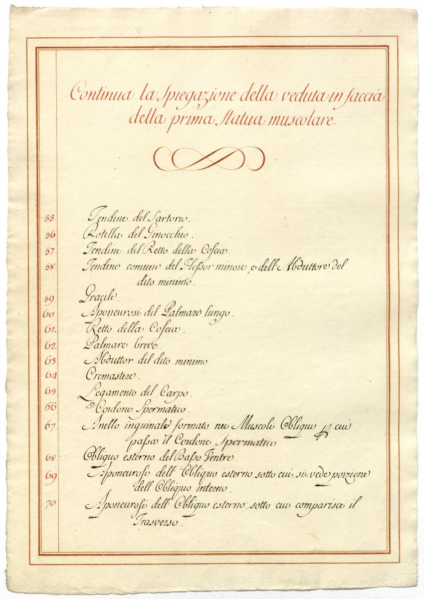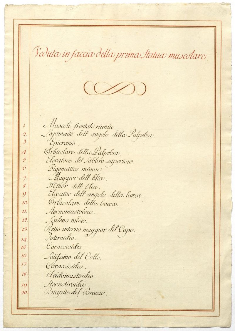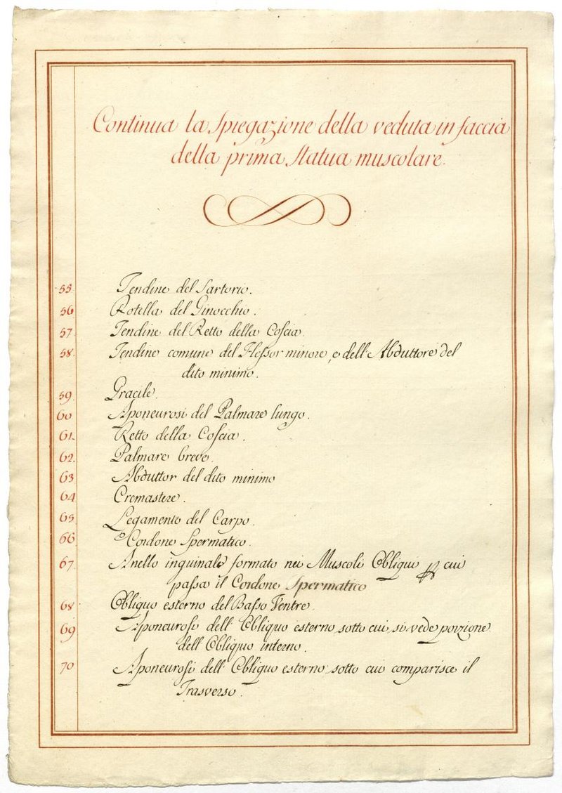 Der Text ist die ergänzende Beschreibung in italienischer Sprache zum anatomischen Wachsmodell der oberflächliche Muskelschicht.