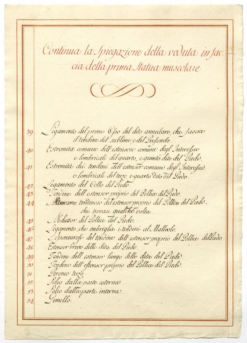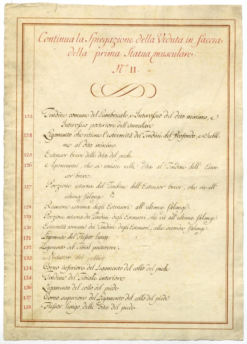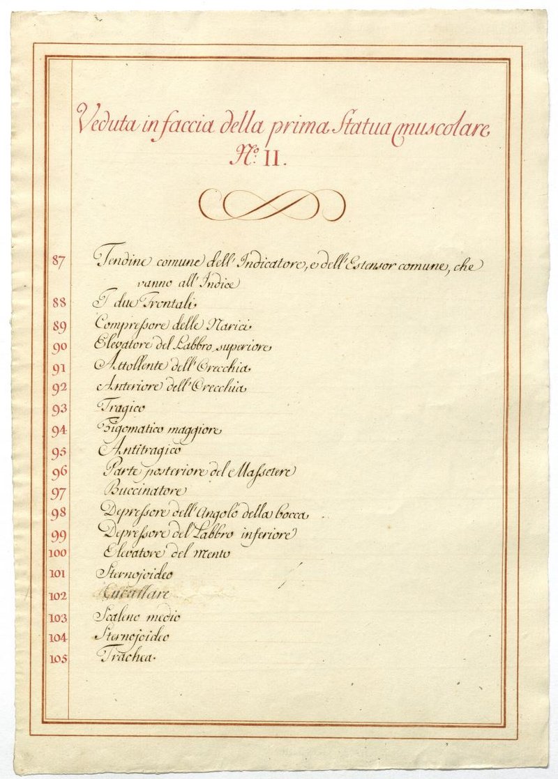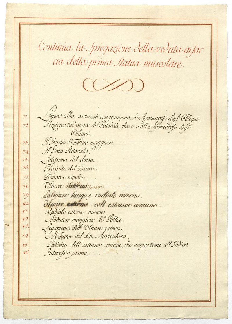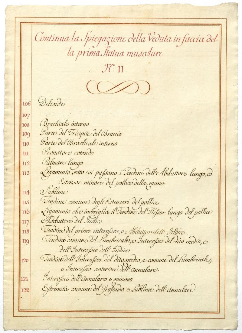 Der Text ist die ergänzende Beschreibung in italienischer Sprache zum anatomischen Wachsmodell der oberflächliche Muskelschicht.
