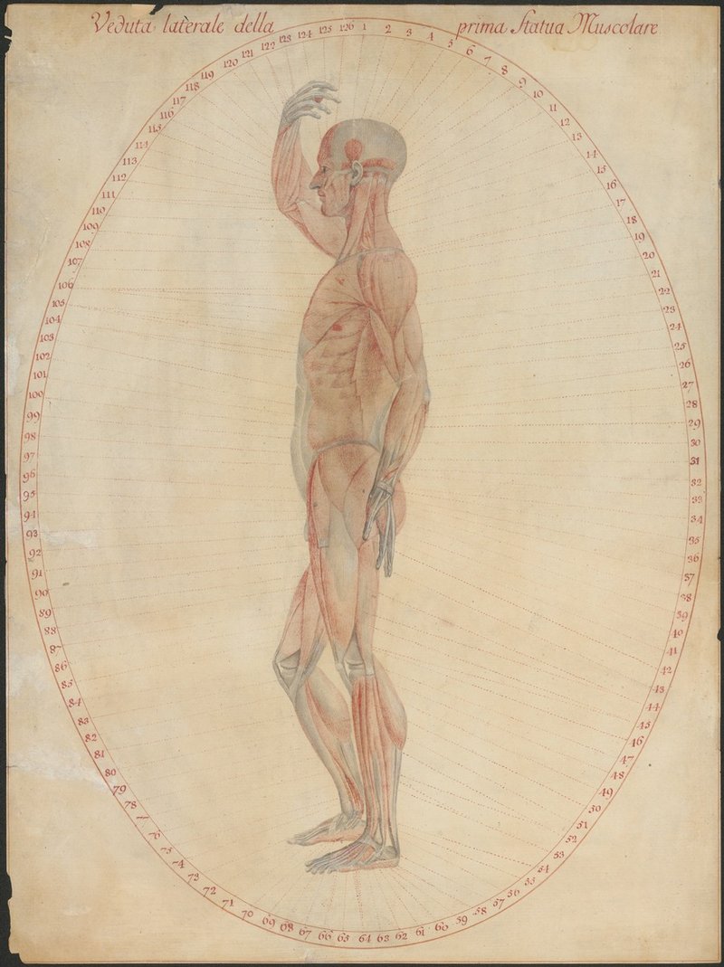 Männlicher Körper: Darstellung der oberflächlichen („ersten") Muskelschicht. Der rechte Arm ist erhoben zur Darstellung der Wände der Achselhöhle (Axilla).