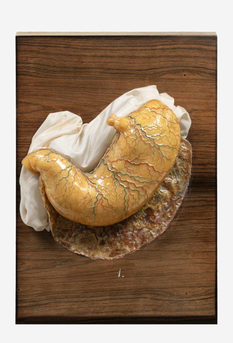 1. Der Magen (Ventriculus) mit einem Teil des großen Netzes (Omentum majus), von vorne.