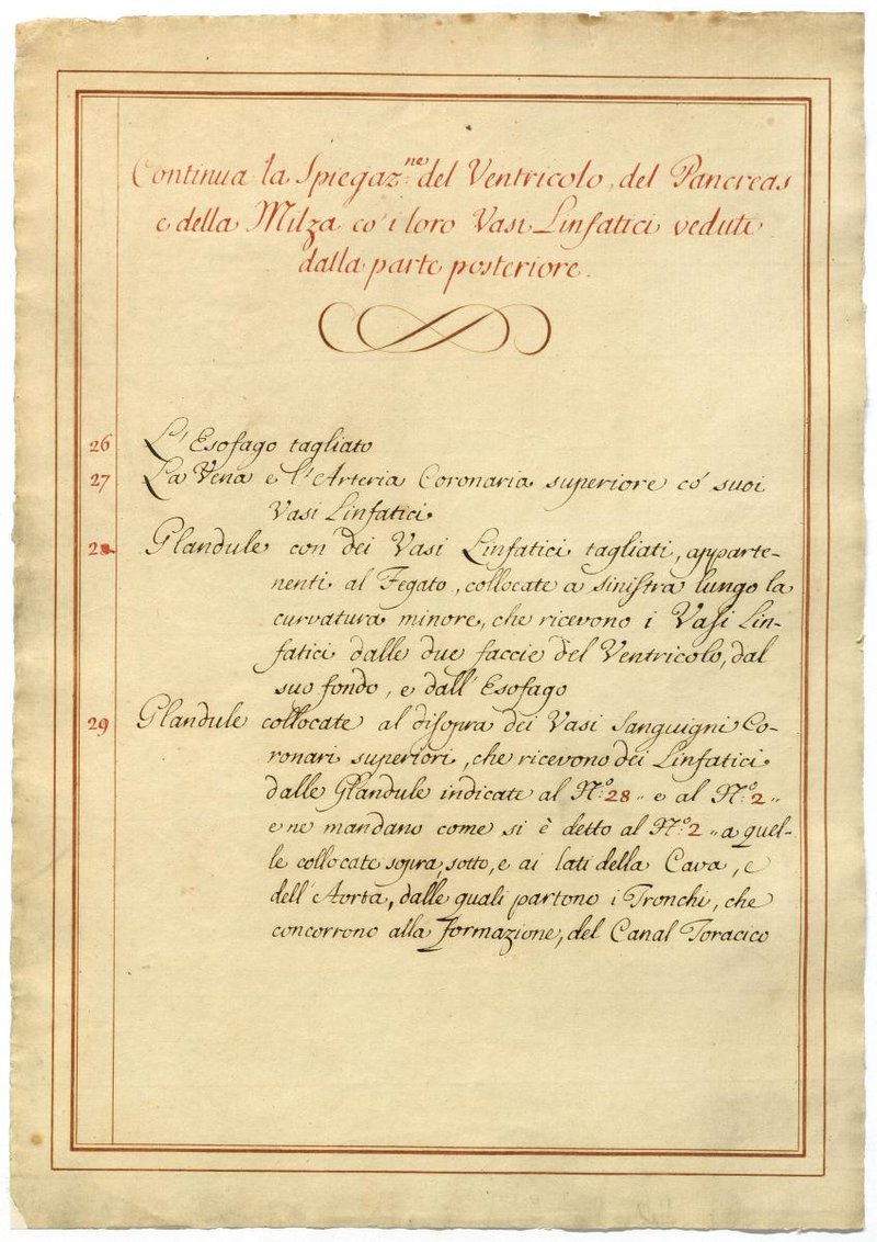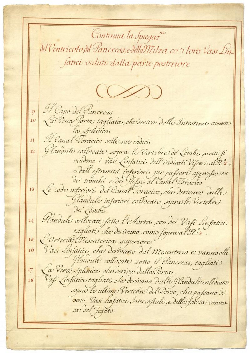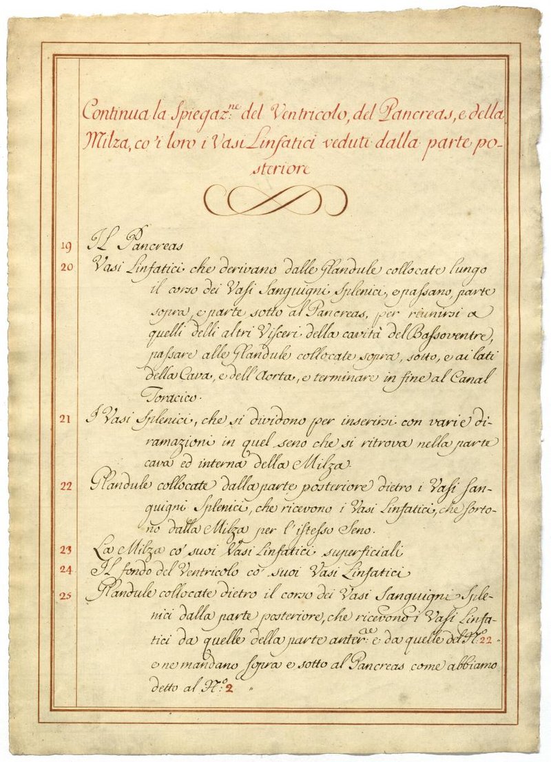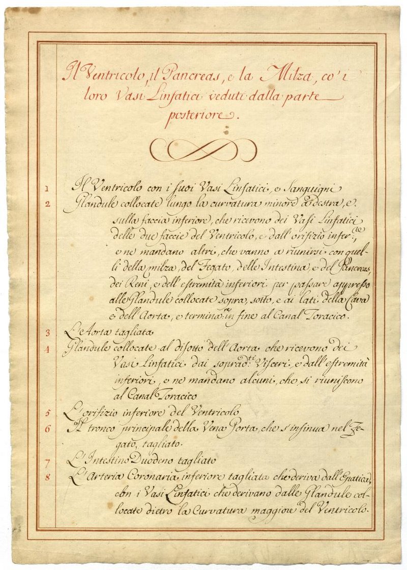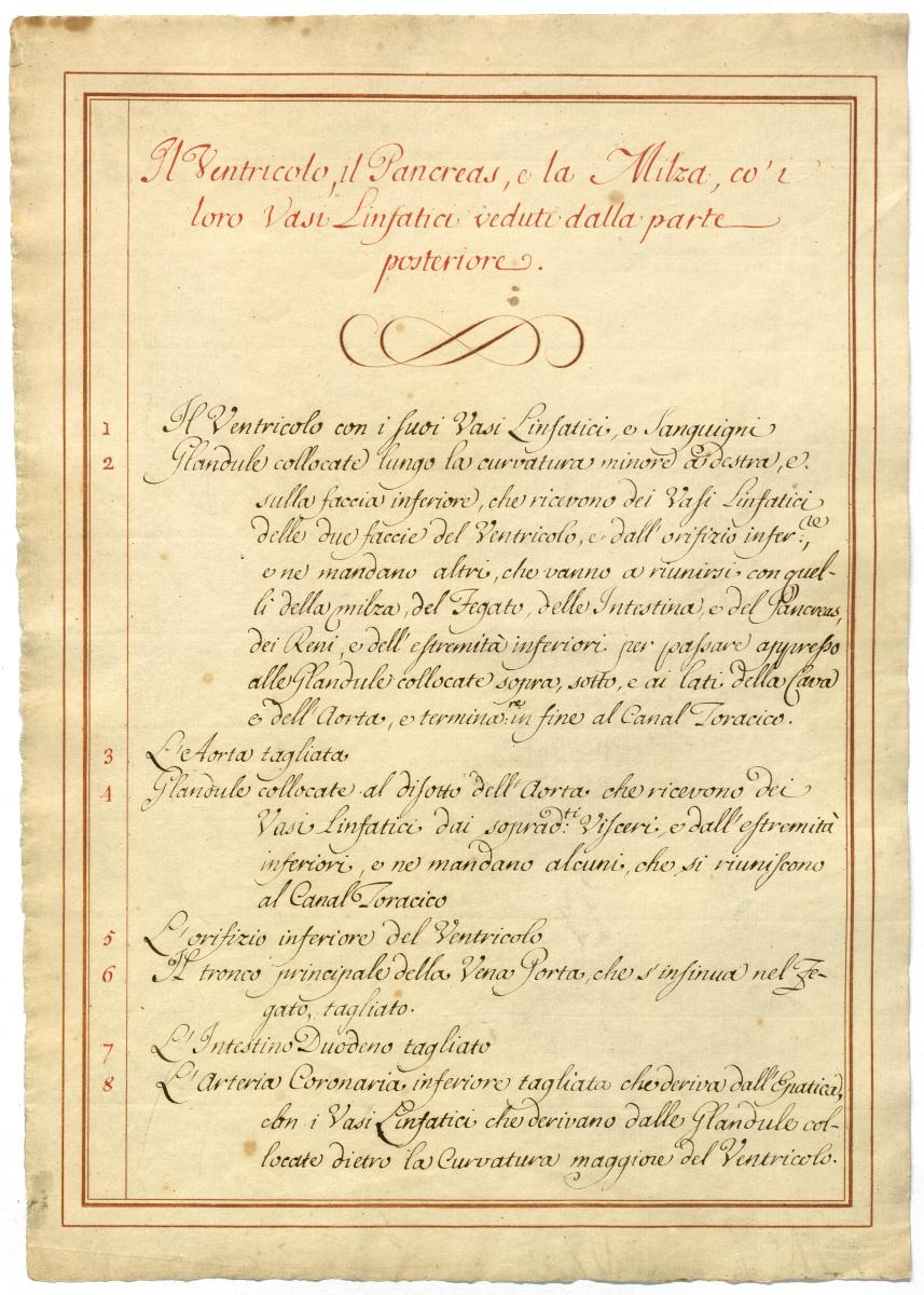 Der Text ist die ergänzende Beschreibung in italienischer Sprache zum anatomischen Wachsmodell der Lymphgefäße des Oberbauchs.