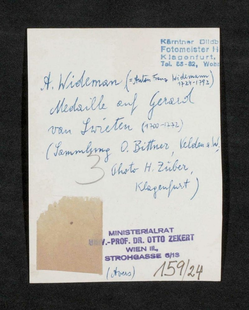 Die Medaille ist von Anton Franz Wideman entworfen worden. Sie befand sich im Besitz der Sammlung O. Bittner, Velden am Wörthersee. Die Fotografie wurde von Hans Zuber, Fotomeister, Klagenfurt, angefertigt. Rückseitig ist außerdem des Namensstempel von Otto Zekert angebracht.