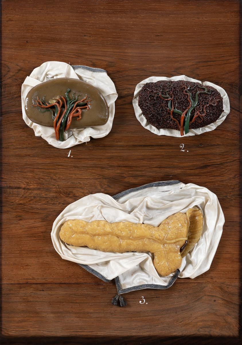 1. Die dem Magen zugekehrte Seite der Milz (Facies visceralis lienis) mit ihren Hüllen (Tunica serosa et tunica albuginea) und Gefäßen (Vasa lienalia) des Milzhilum. 2. Die dem Magen zugekehrte Seite der Milz (Facies visceralis lienis) ohne ihre Hüllen (Tunica serosa et tunica albuginea) des Milzhilum. 3. Die Bauchspeicheldrüse (Pancreas) mit ihrem Ausführungsgang (Ductus pancreaticus), der Hauptgallengang (Ductus choledochus) und die gemeinsame Einmündung beider Gänge in den eröffneten Zwölffingerdarm (Duodenum) von hinten.