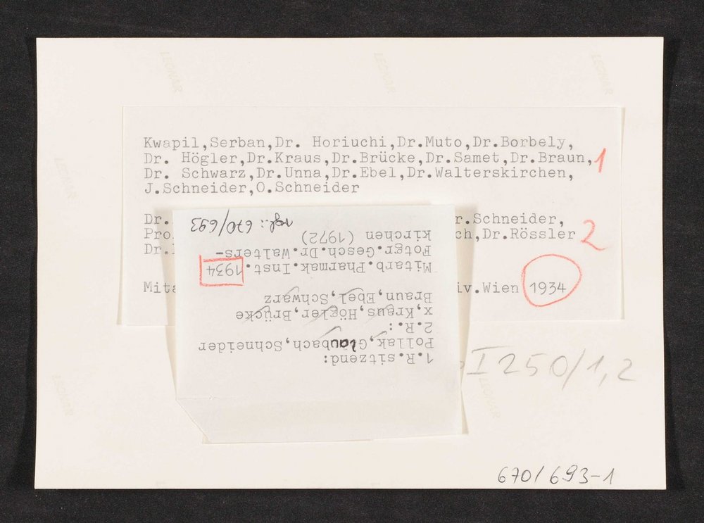 Reproduktion einer Fotografie aus dem Jahr 1934, die sich zum Zeitpunkt der Entstehung der Kopie im Besitz des Pharmakologischen Institutes befand.
