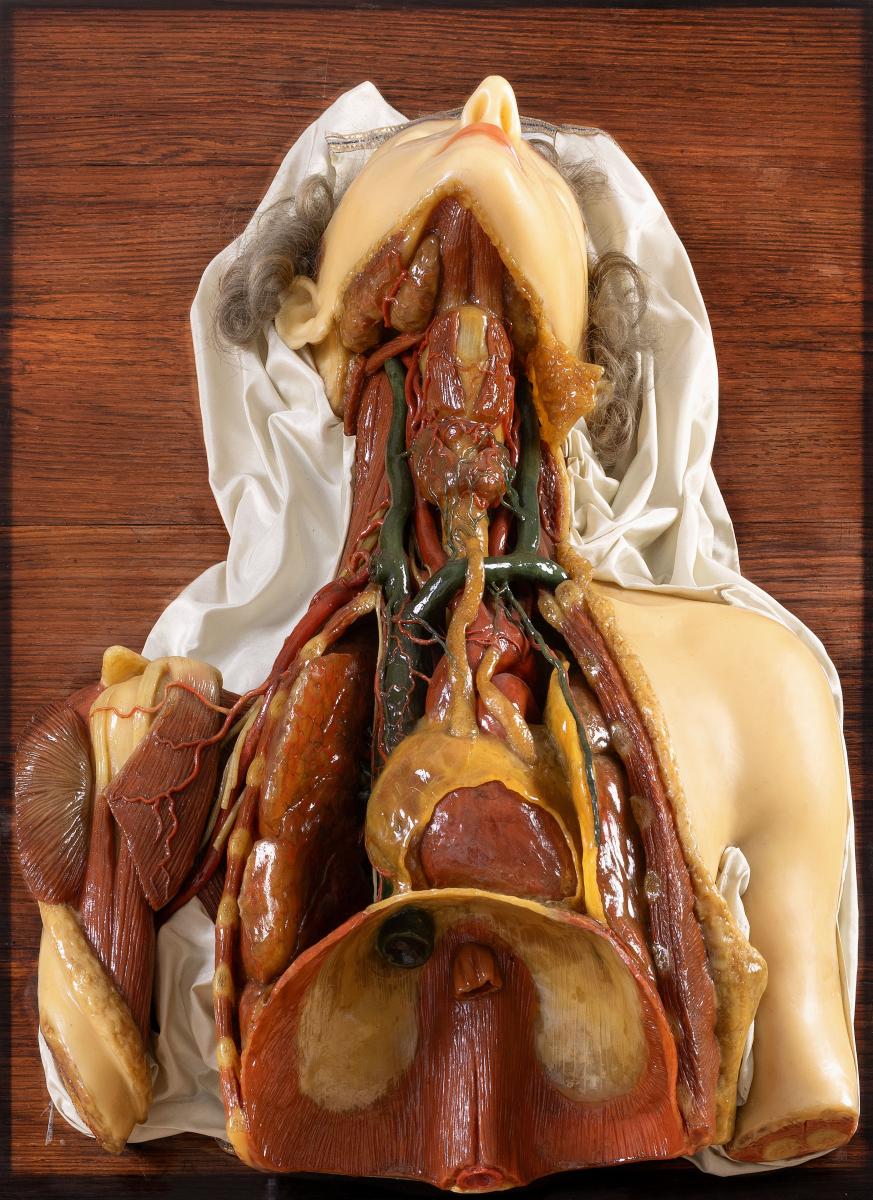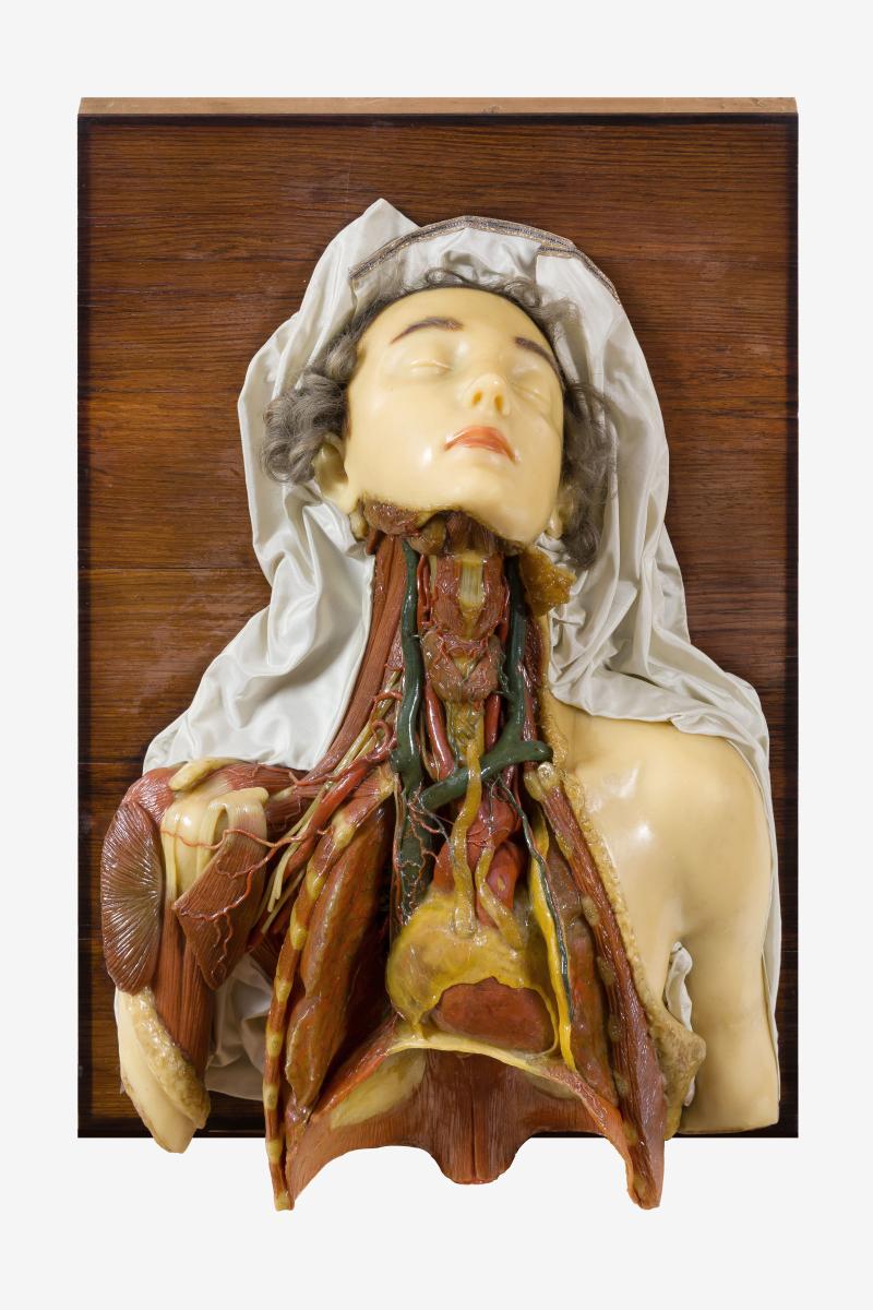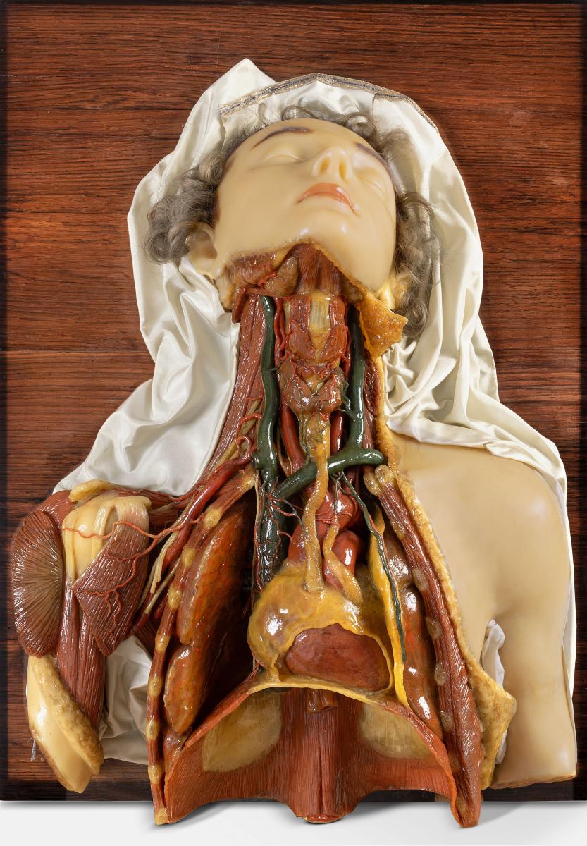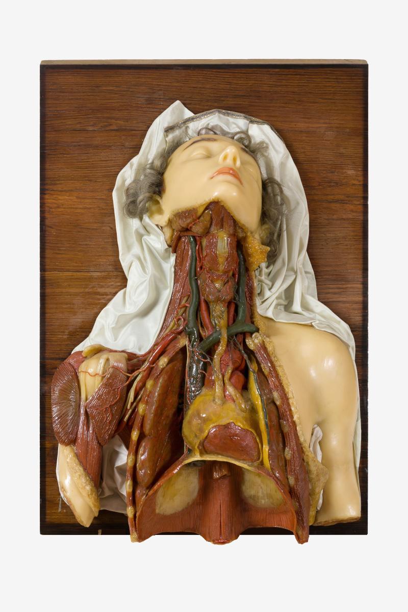 1. Im eröffneten Brustkorb erhält man einen Überblick über den Mittelfellraum (Mediastinum) mit seinen Organen (Herz mit eröffnetem Herzbeutel, Bries [Thymus]) und großen Gefäßen. Die Lungen sind nach links und rechts abgedrängt. Die Gefäße sind in den Hals und zur rechten Schulterregion weiterverfolgt. Man sieht den Zusammenfluss von den inneren Drosselvenen (Venae jugulares internae) und den Unterschlüsselbeinvenen (Venae subclaviae) in die obere Hohlvene (Vena cava superior). Arteriell liegt der Fokus auf den Ästen der rechten Unterschlüsselbeinarterie (Arteria subclavia) – innere Brustwandarterie (Arteria thoracica interna), Vertebralarterie (Arteria vertebralis), Truncus thyrocervicalis und Truncus costocervicalis.