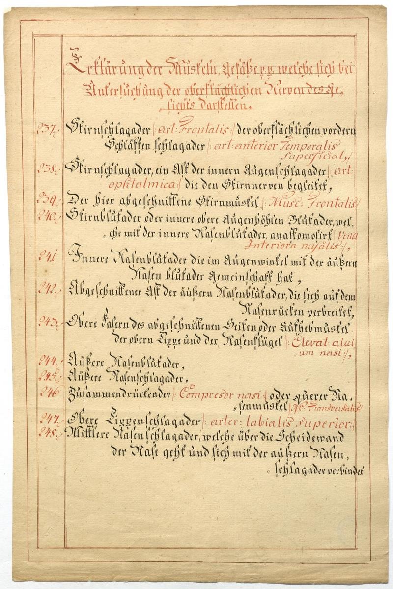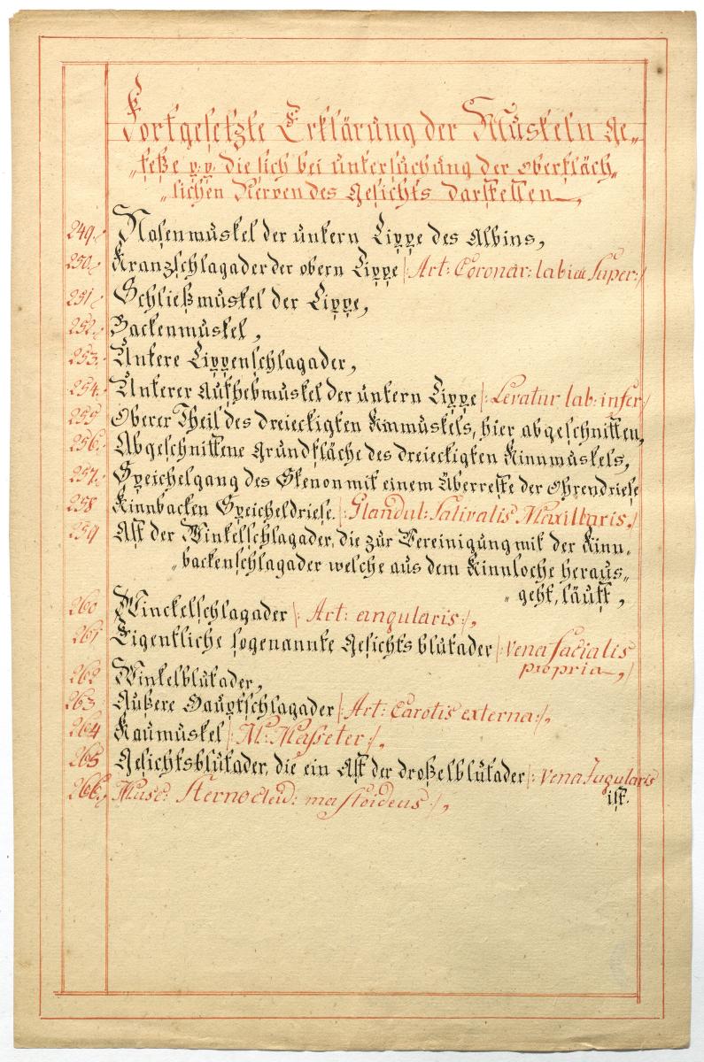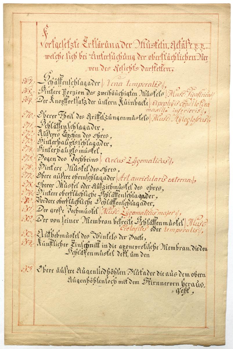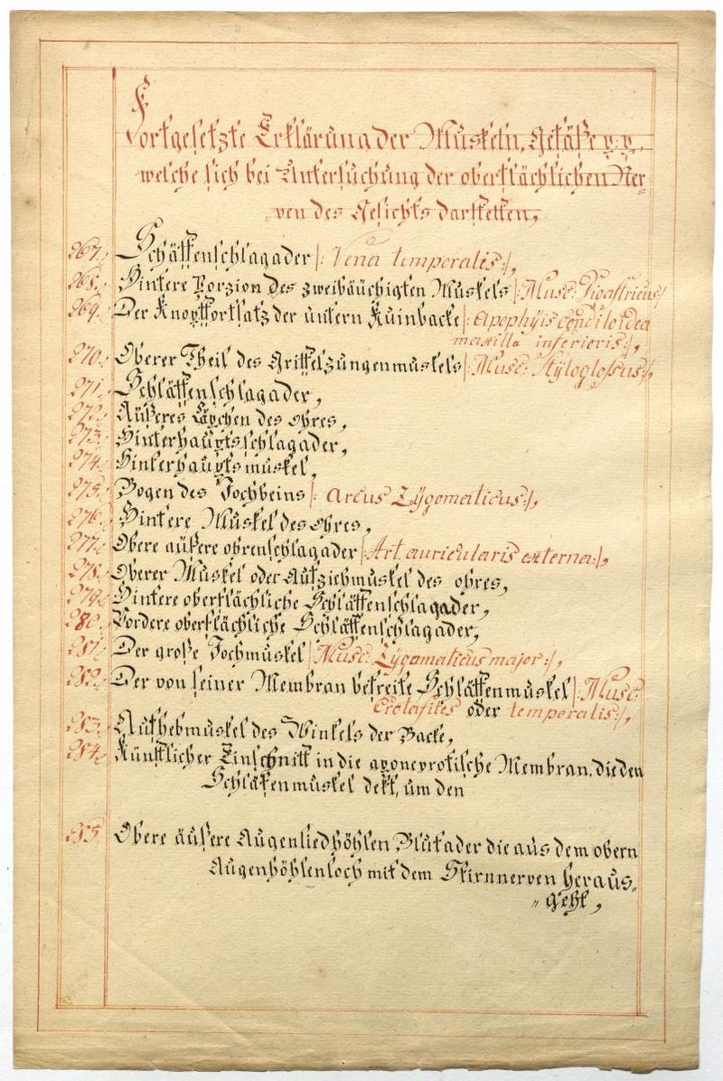 Der Text ist die ergänzende Beschreibung in deutscher Sprache zum anatomischen Wachsmodell der Muskeln, Blutgefäße und Nerven im Gesichtbereich. Das Präparat fehlt.