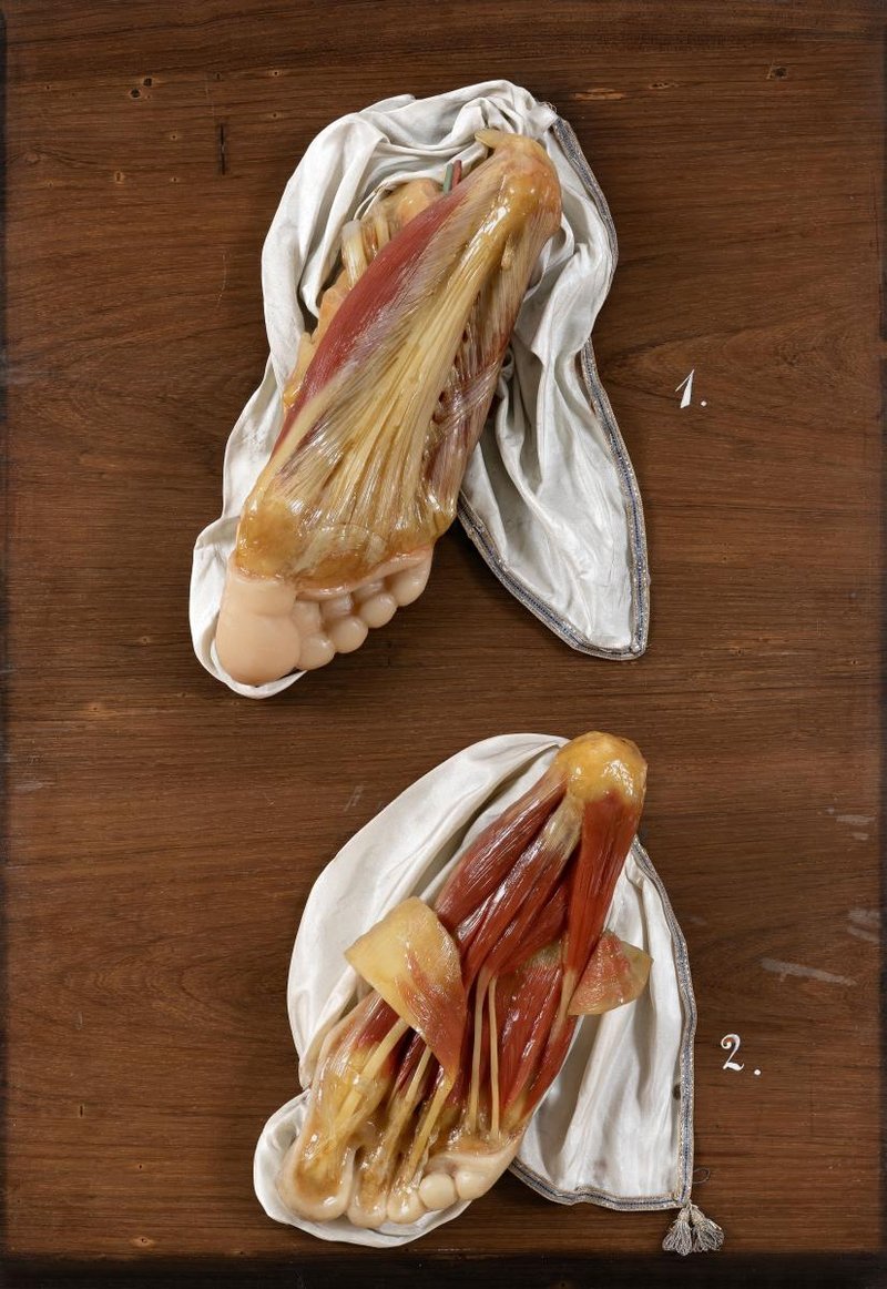 1. Rechter Fuß von plantar, die Haut und das Unterhautfettgewebe über der Fußsohle wurde entfernt: Die Aponeurosis plantaris (Plantarfaszie) und die an ihrem Rande zum Vorschein kommenden Muskeln des Großzehen- und Kleinzehenballens. 2. Rechter Fuß von plantar, die Muskeln der Fußsohle nach Entfernung der Aponeurosis plantaris (Plantarfaszie): Musculus abductor digiti minimi, Musculus quadratus plantae, Musculus flexor digiti minimi brevis (kurzer Kleinzehenbeuger), Musculus interosseus III., Musculus flexor digitorum brevis, Musculus lumbricalis III. und Musculus lumbricalis Ivena, Musculus flexor hallucis longus (langer Großzehenbeuger) und Musculus flexor hallucis brevis (kurzer Großzehenbeuger) sowie Musculus abductor hallucis.