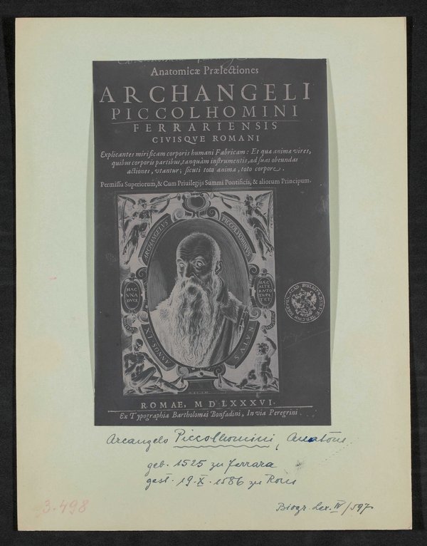 Das Porträt ist auf dem Titelblatt zu Archangelo Piccolomini Buch Anatomicae praelectiones aus dem Jahr 1586.