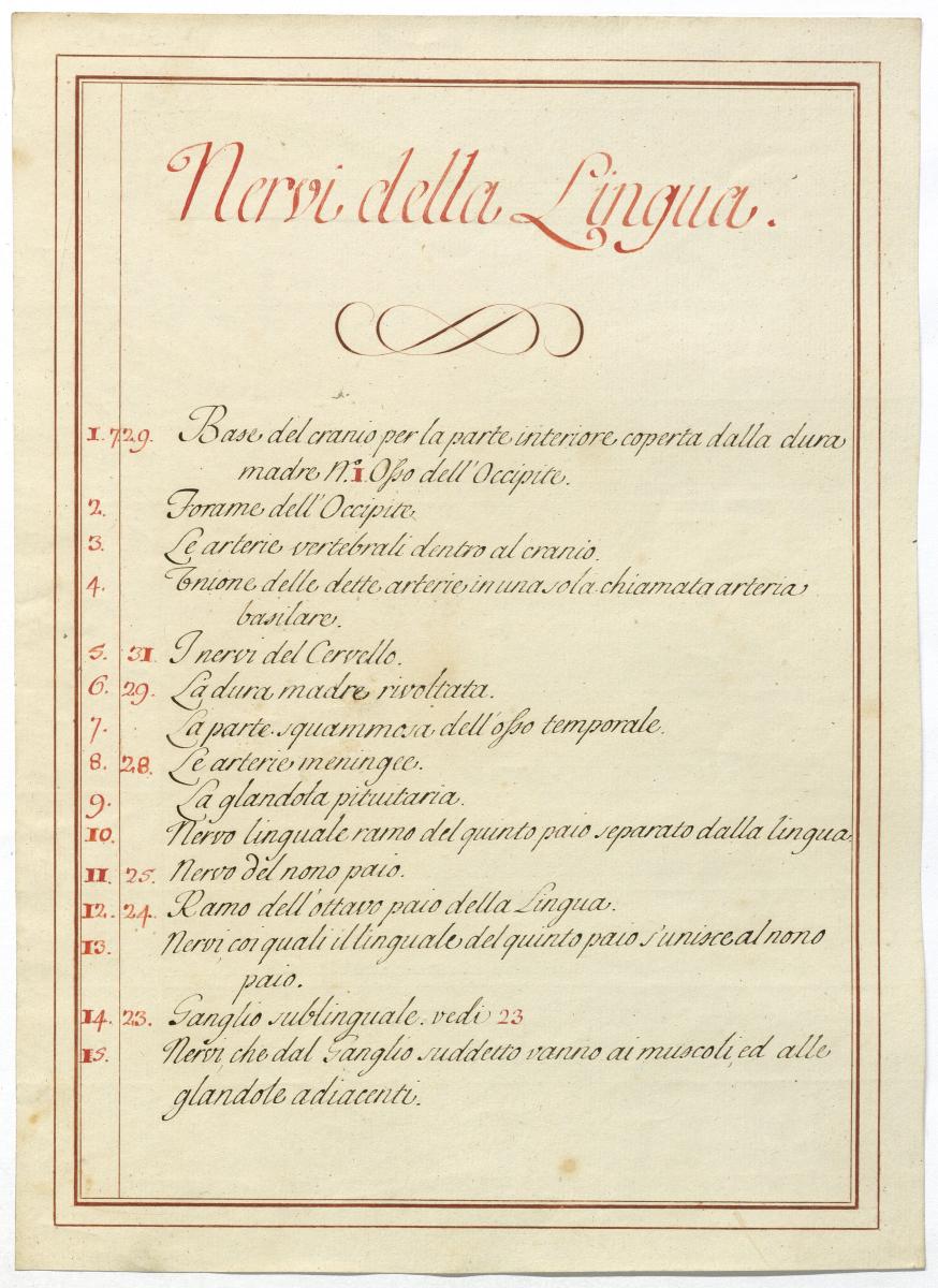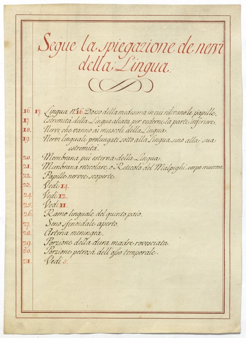 Der Text ist die ergänzende Beschreibung in italienischer Sprache zum anatomischen Wachsmodell der Zunge.