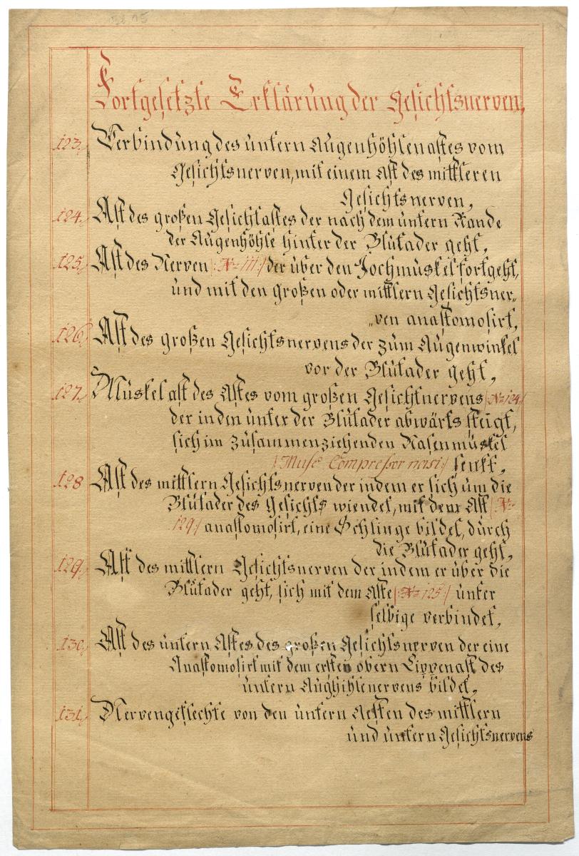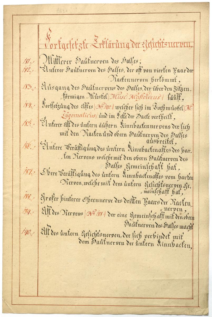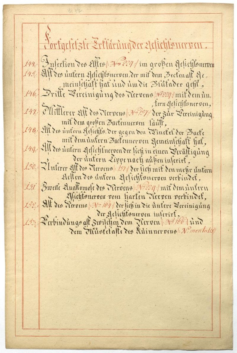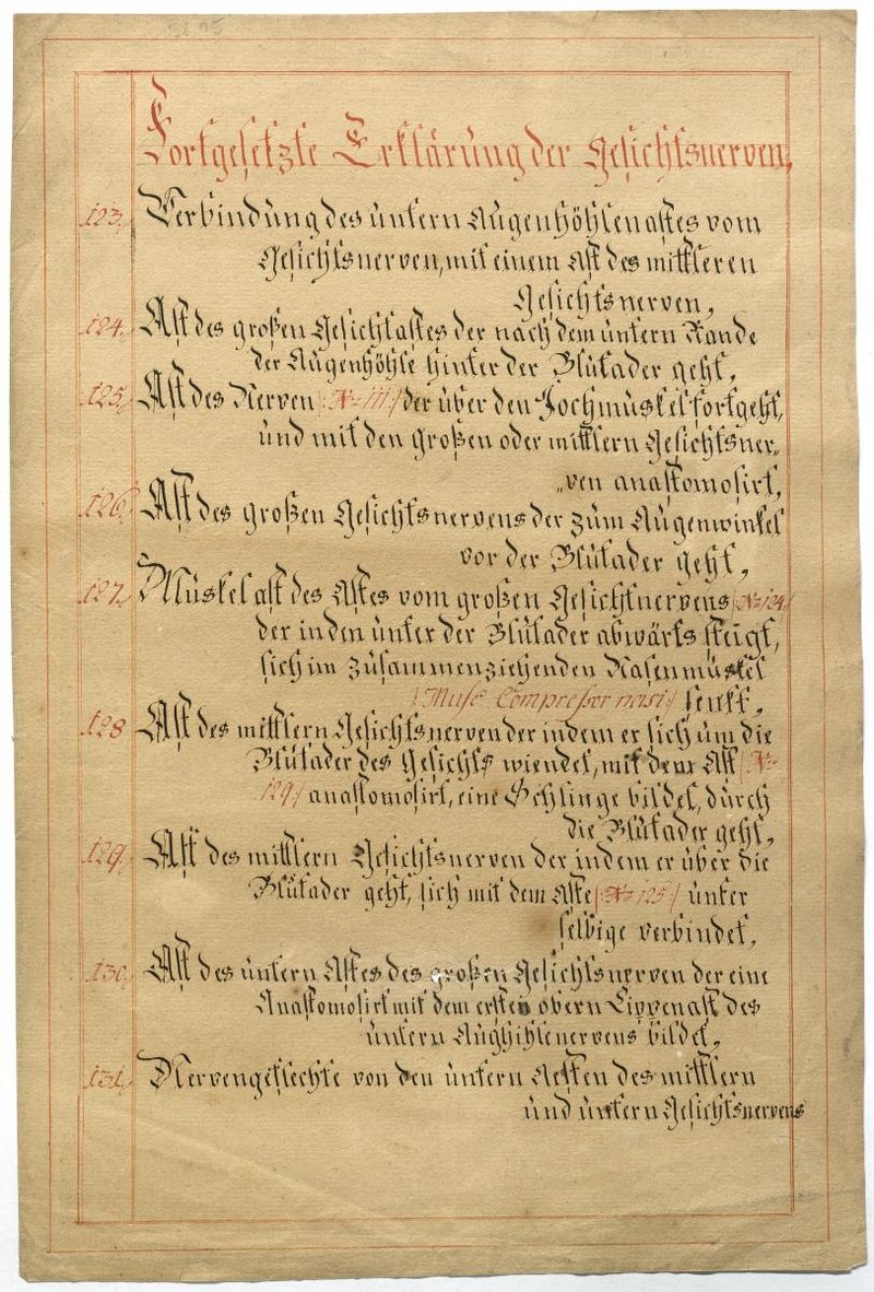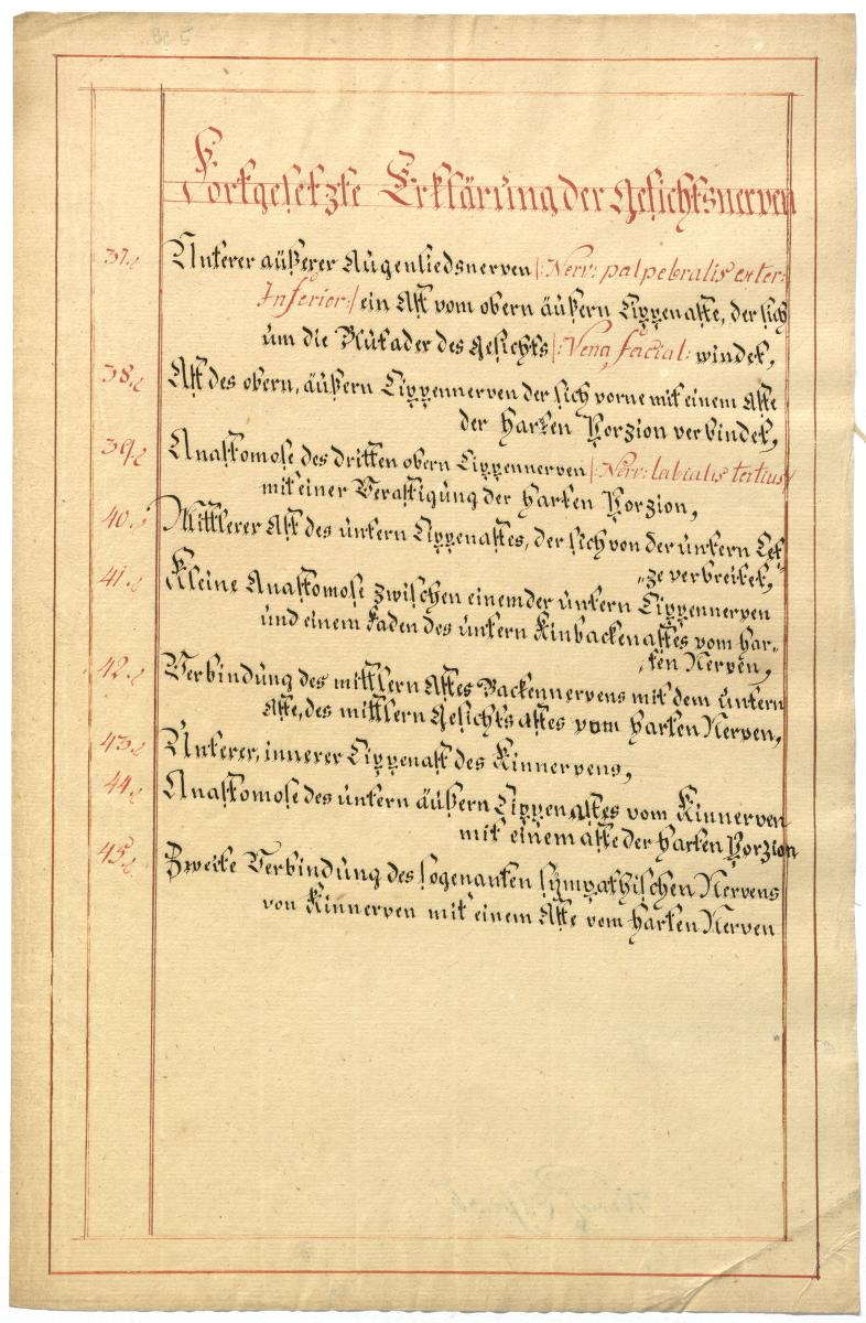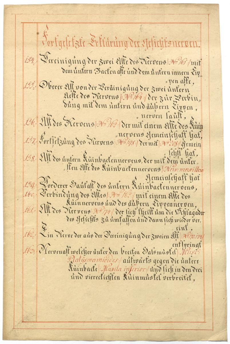 Der Text ist die ergänzende Beschreibung in deutscher Sprache zum anatomischen Wachsmodell der Gesichtsnerven. Das Präparat, sowie die Kolorierte Zeichnung fehlen.