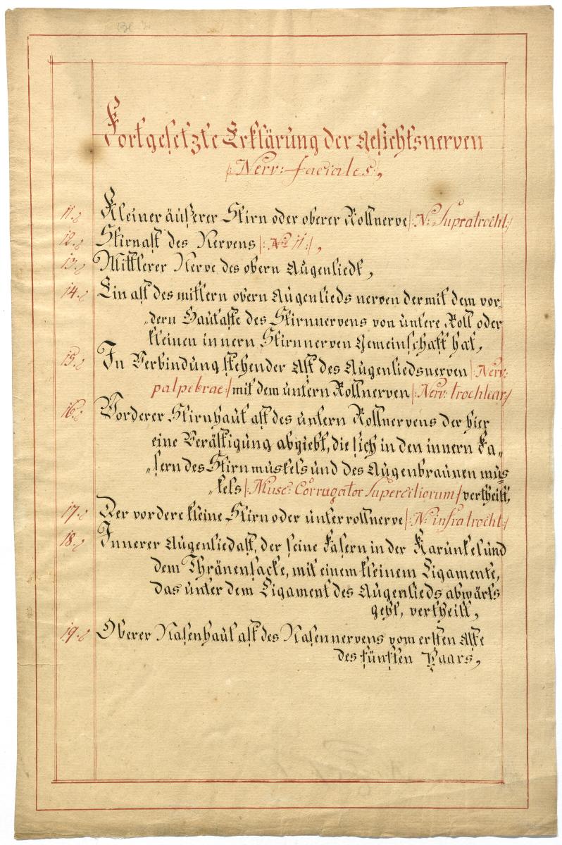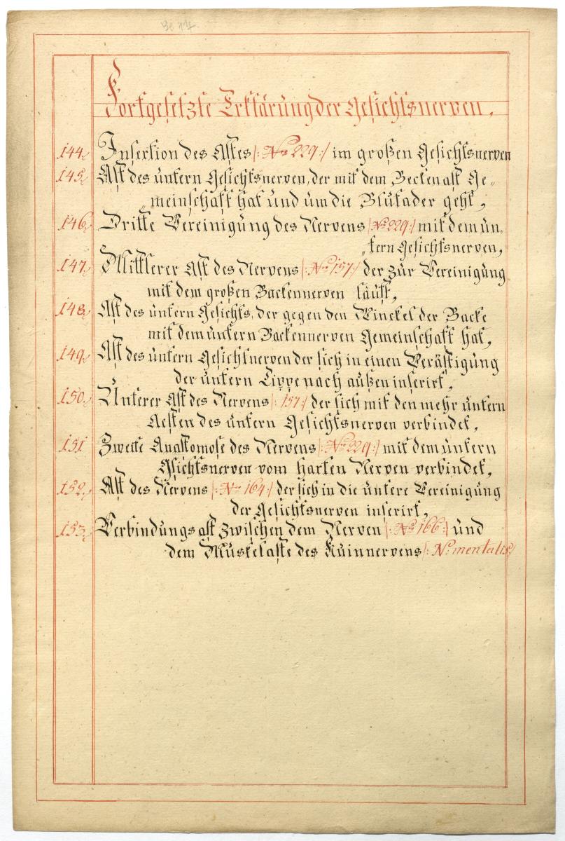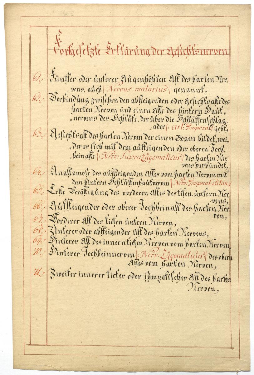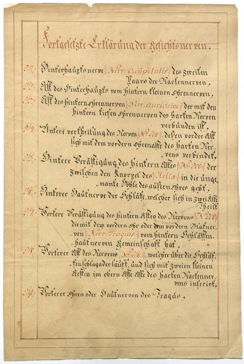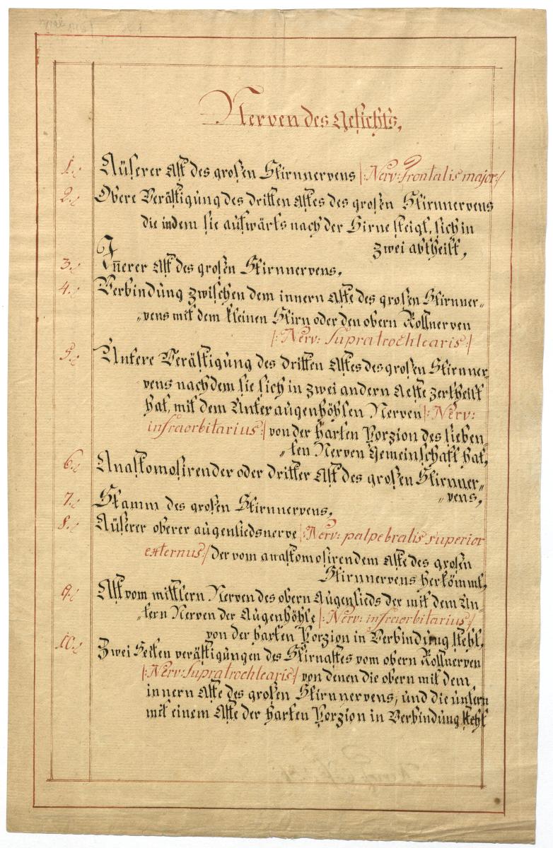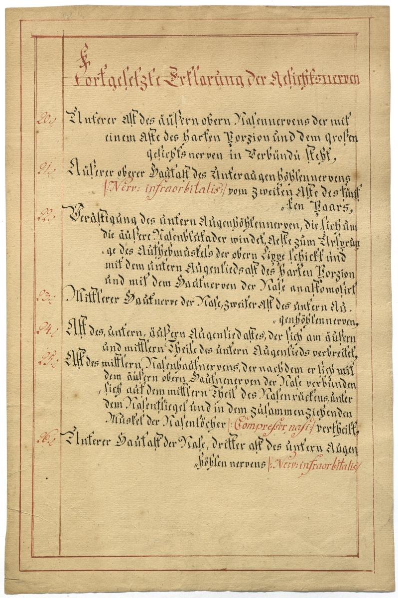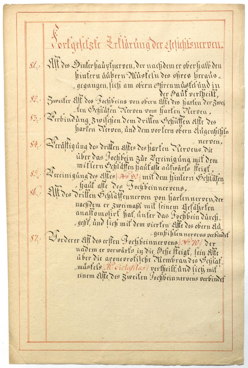 Der Text ist die ergänzende Beschreibung in deutscher Sprache zum anatomischen Wachsmodell der Gesichtsnerven. Das Präparat, sowie die Kolorierte Zeichnung fehlen.