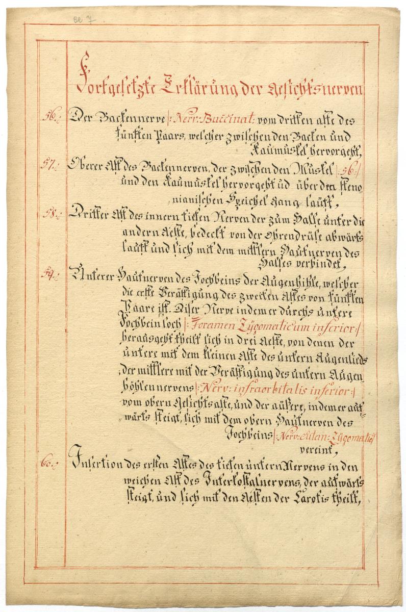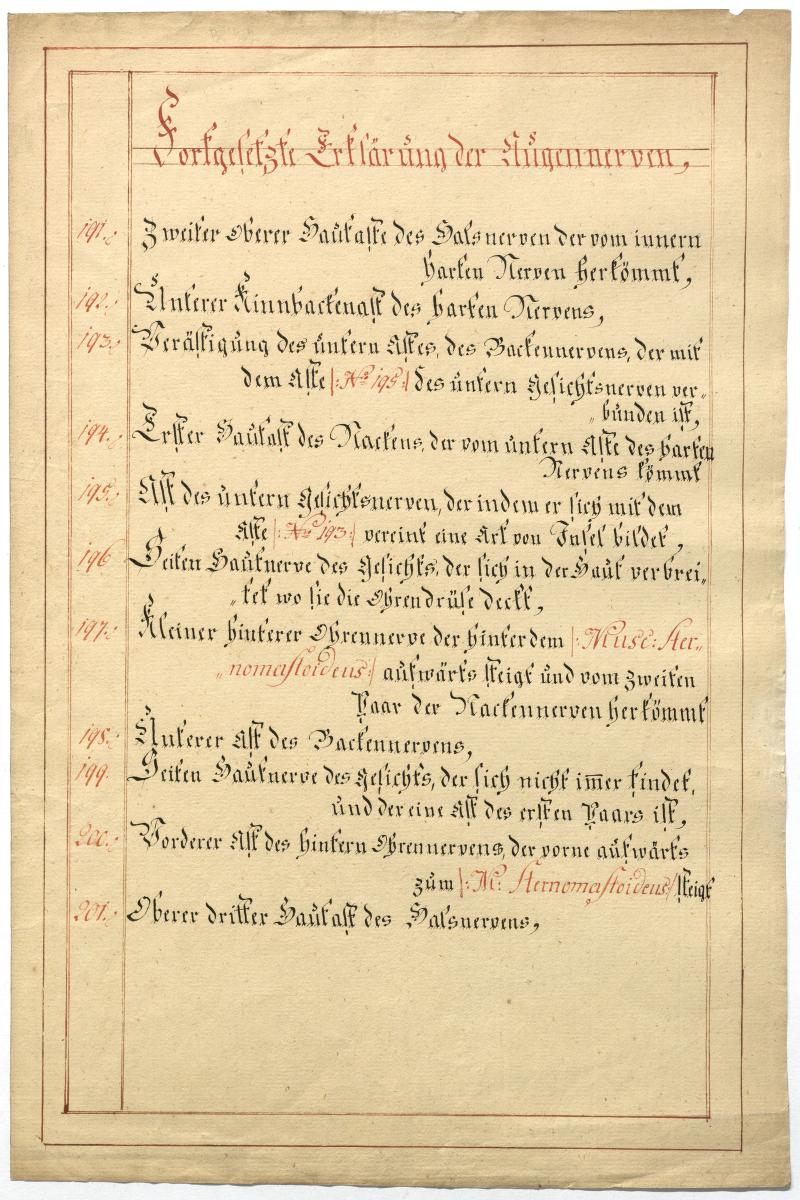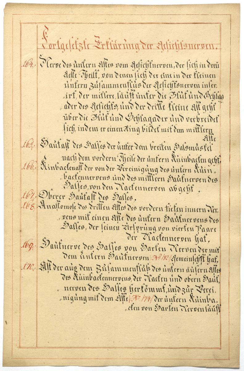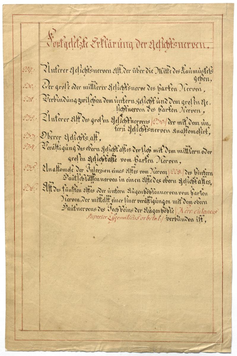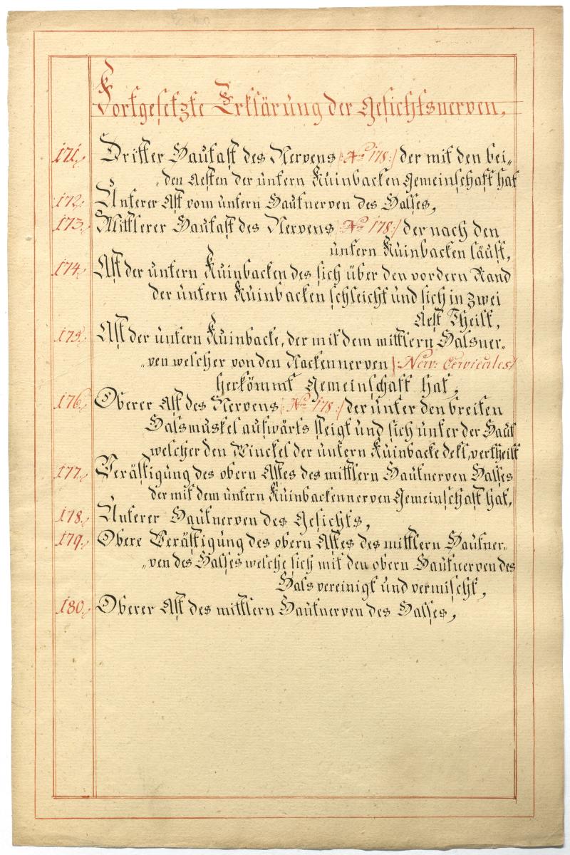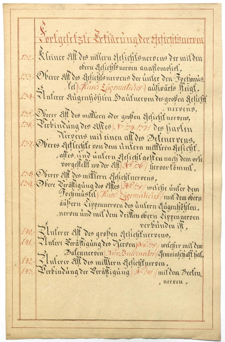 Der Text ist die ergänzende Beschreibung in deutscher Sprache zum anatomischen Wachsmodell der Gesichtsnerven. Das Präparat, sowie die Kolorierte Zeichnung fehlen.