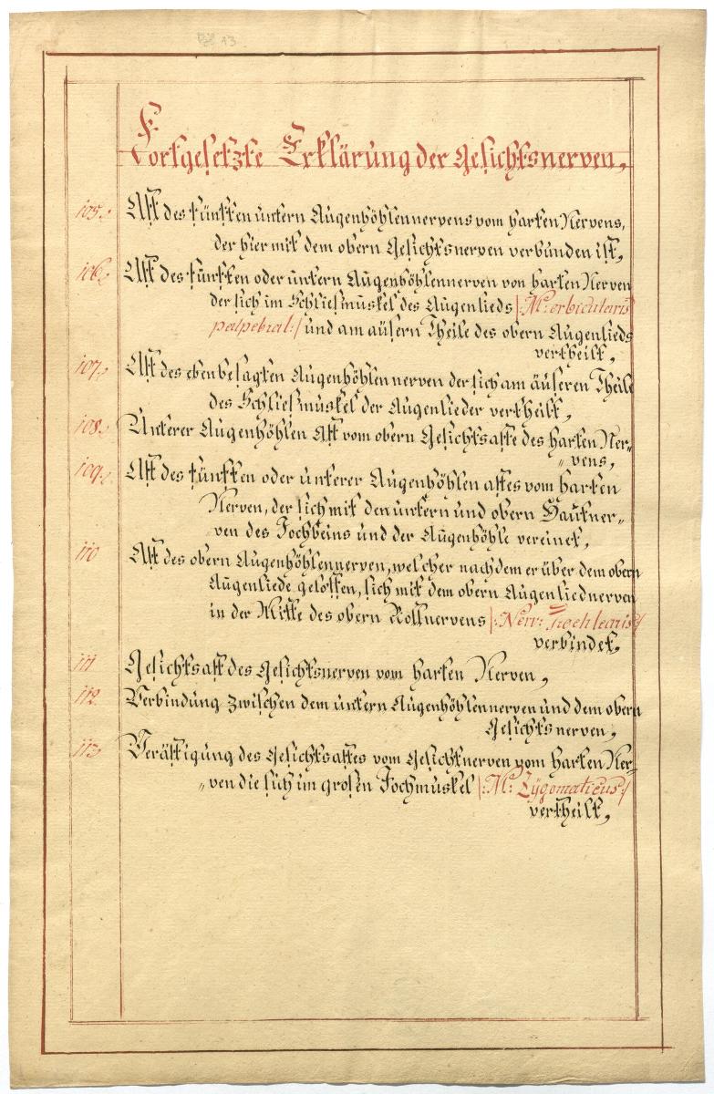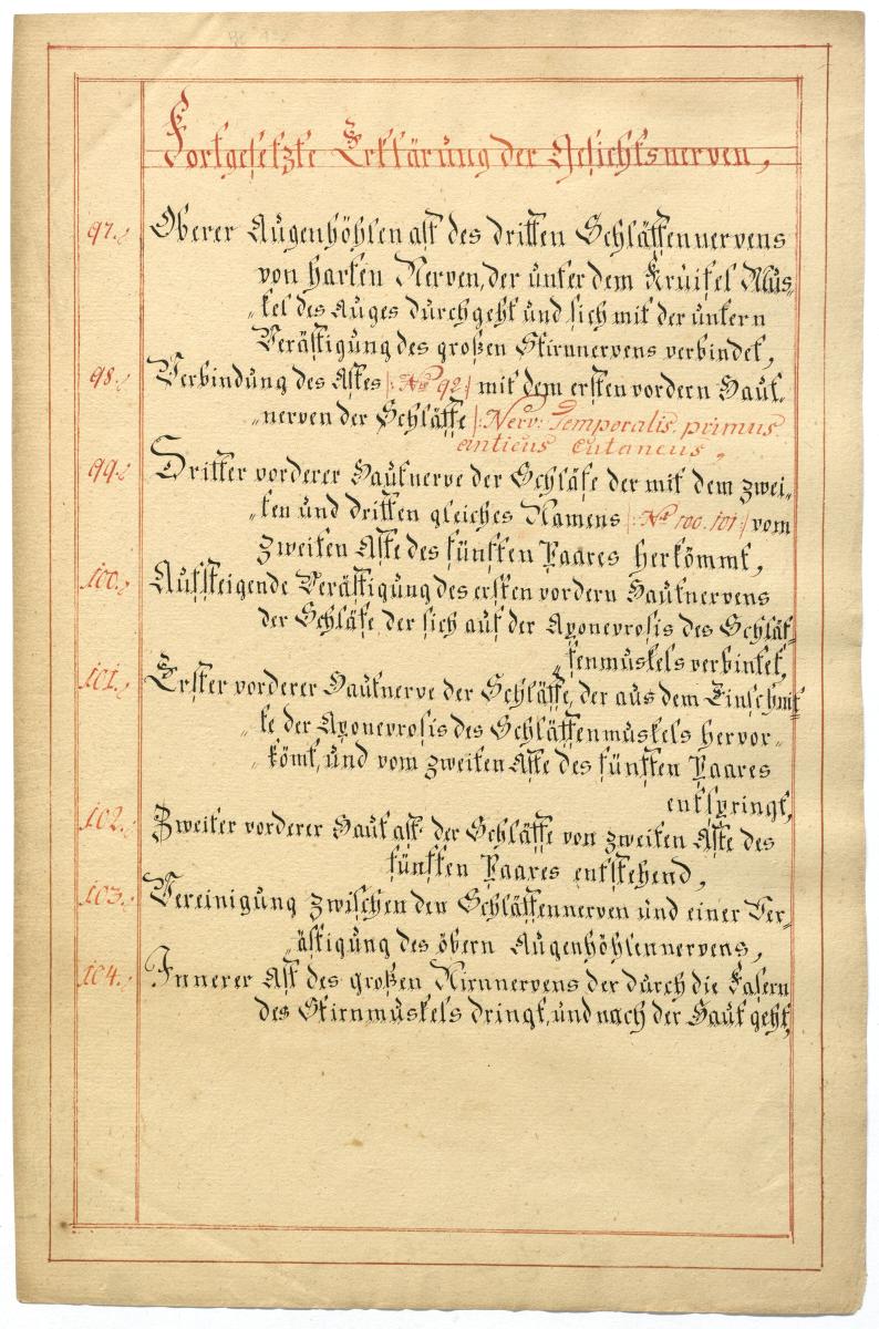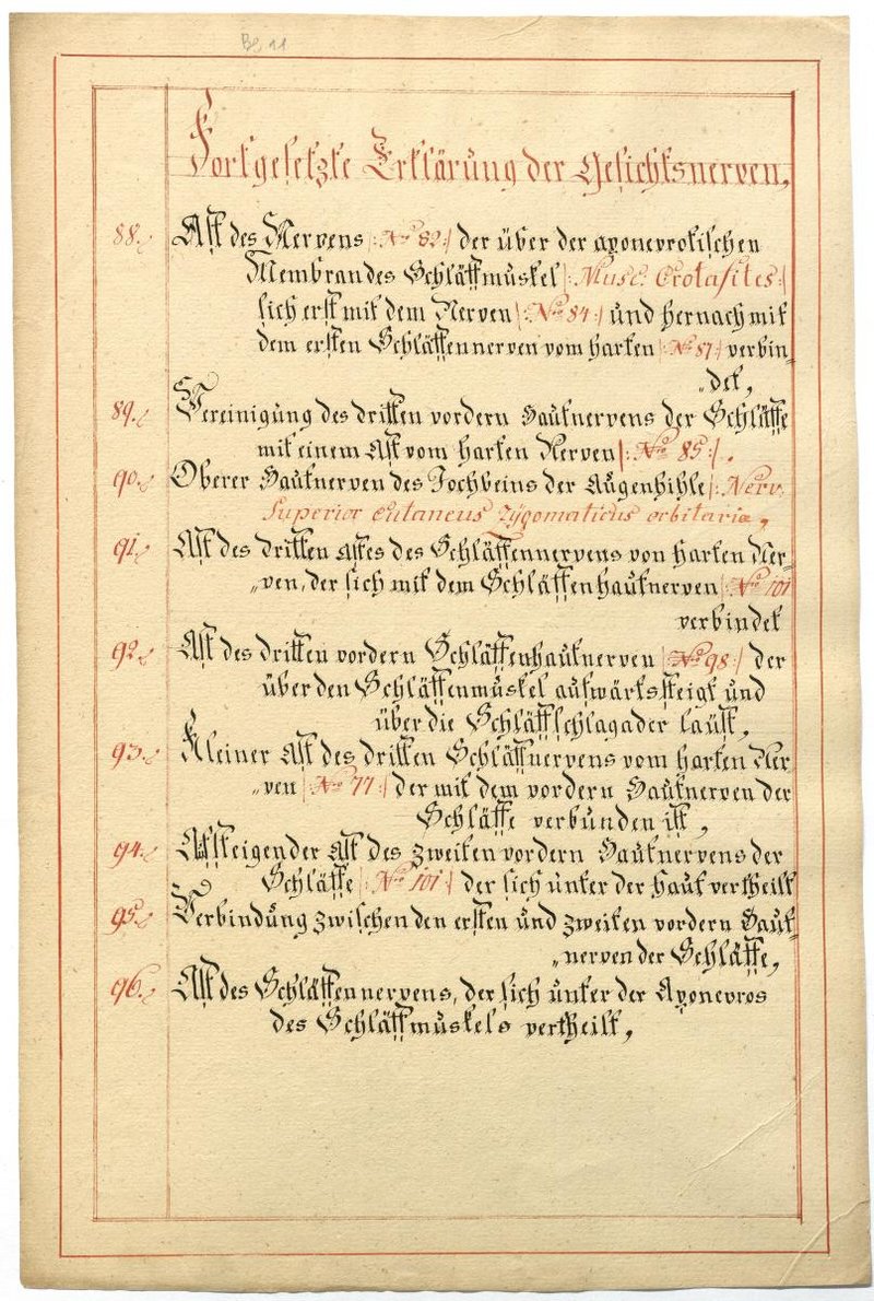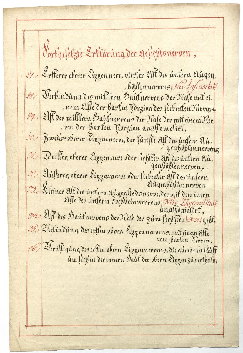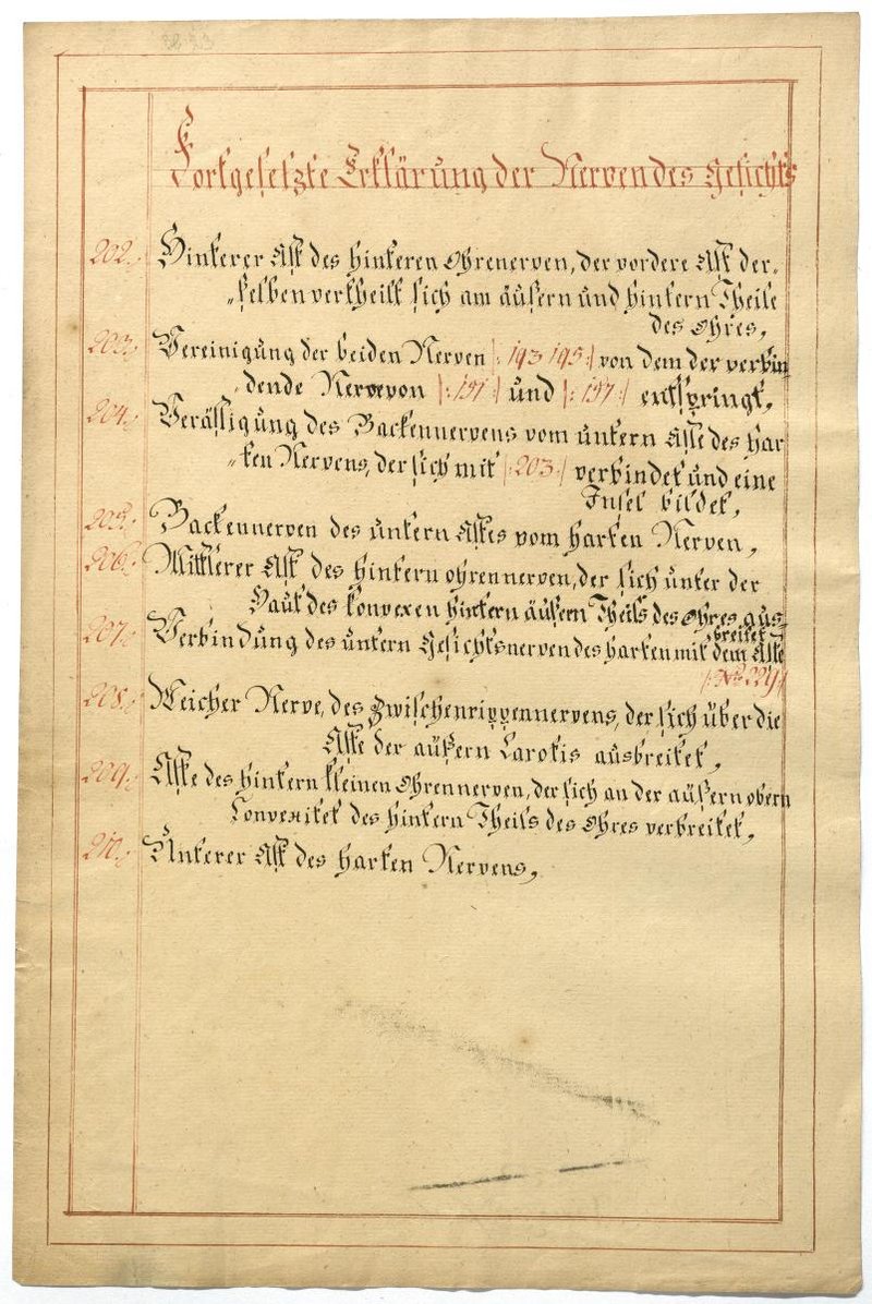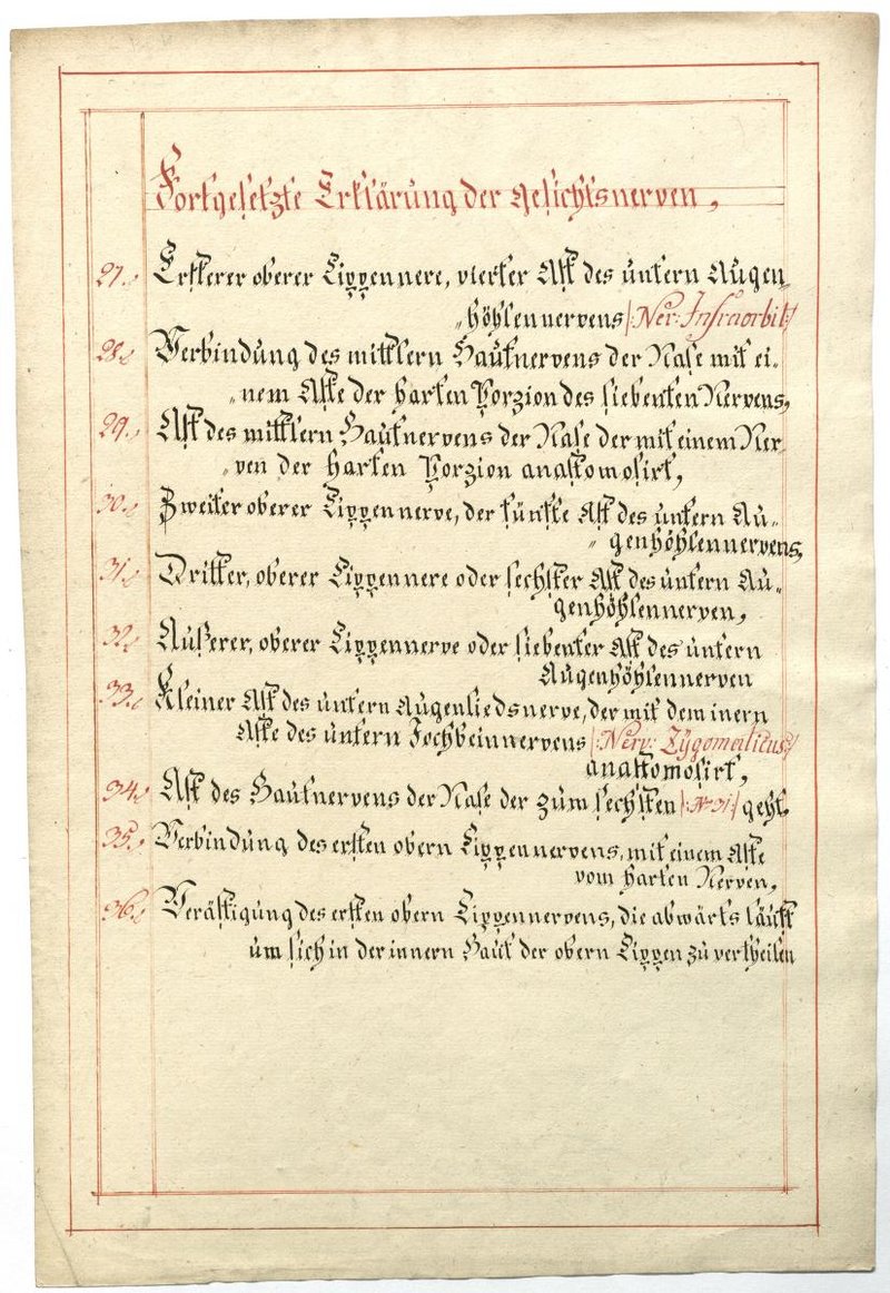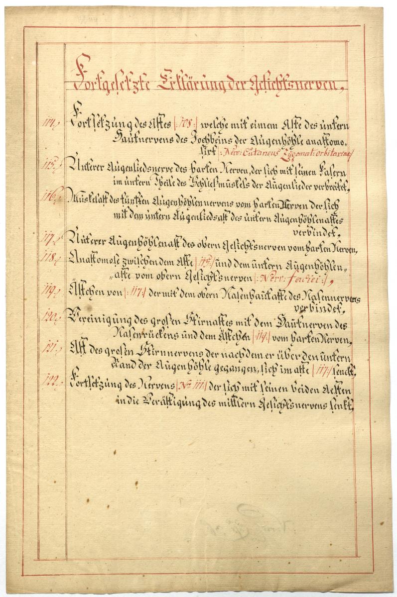 Der Text ist die ergänzende Beschreibung in deutscher Sprache zum anatomischen Wachsmodell der Gesichtsnerven. Das Präparat, sowie die Kolorierte Zeichnung fehlen.