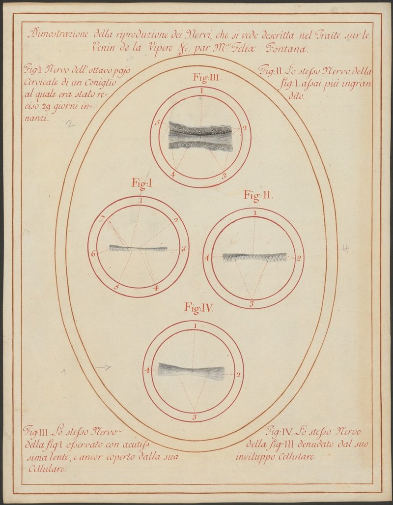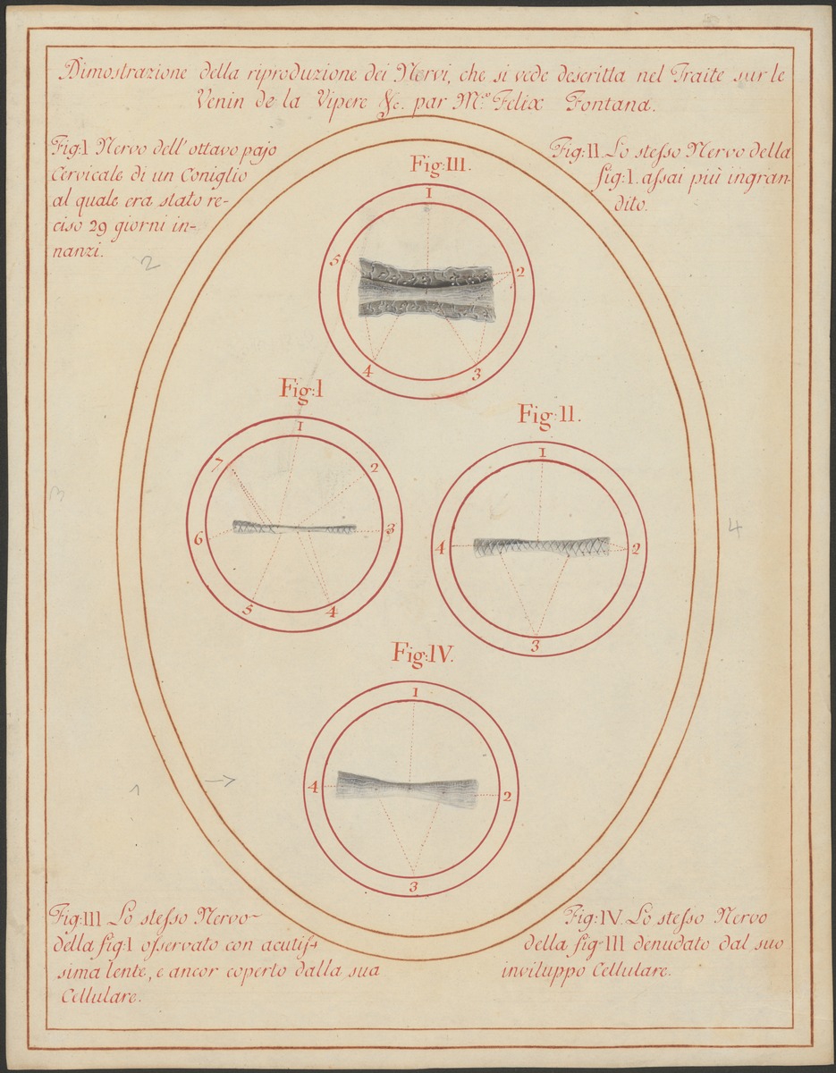 Fig. 4: 311/1: Stück eines Nerven, vergrößert dargestellt. Fig. 2: 311/2: Stück eines Nerven und seiner bindegewebigen Hülle (Perineurium). Fig. 1: 311/3: Stück eines Nerven, der durchtrennt wurde und wieder zusammengewachsen ist. Fig. 3: 311/4: Der gleiche Nerv, vergrößert dargestellt.