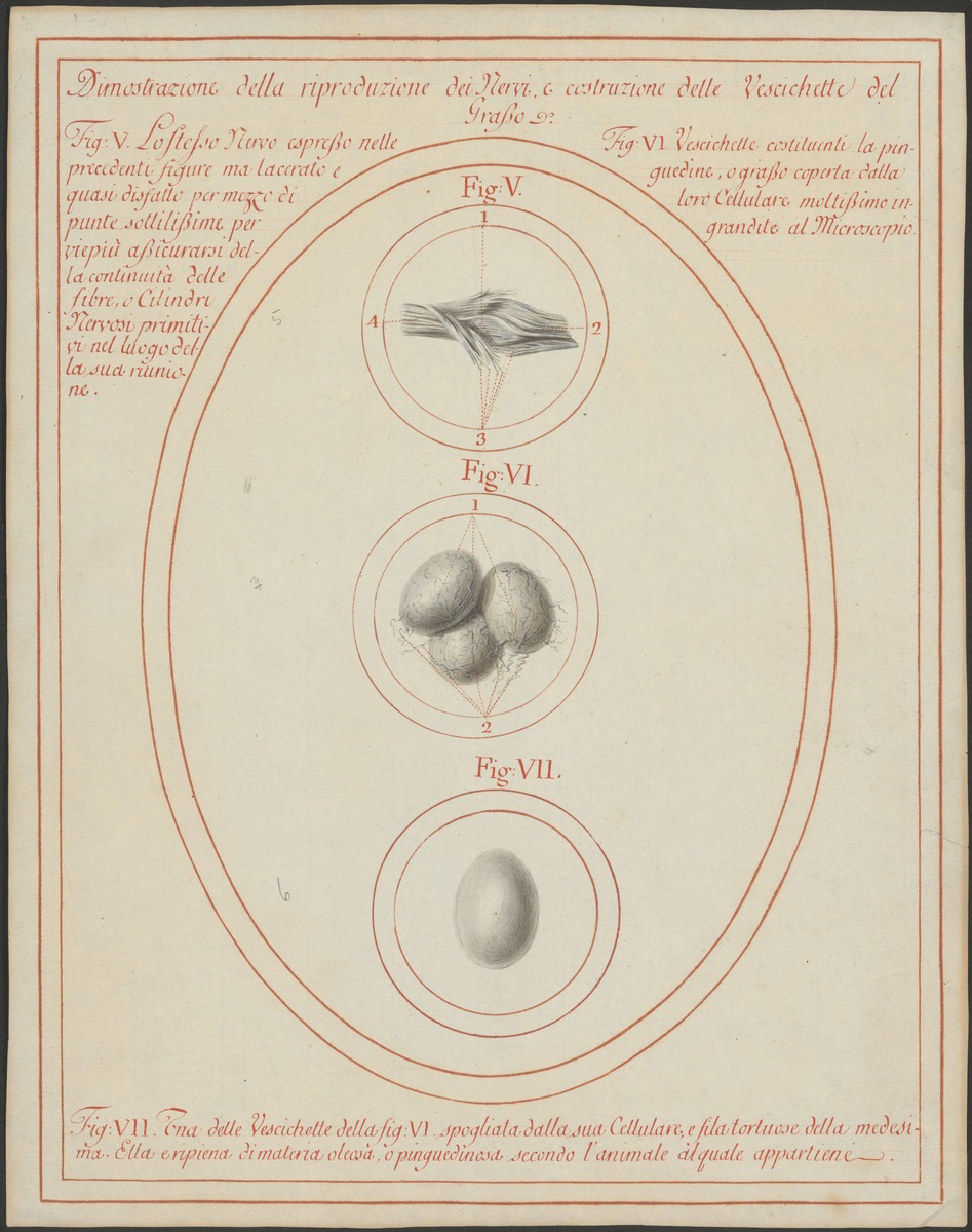 Fig. 5: 311/5: Der gleiche Nerv, aufgefasert. Fig. 7: 311/6: Eine Fettzelle, vergrößert dargestellt. Fig. 6: 311/7: Drei Fettzellen und das verbindende Bindegewebe, vergrößert dargestellt.