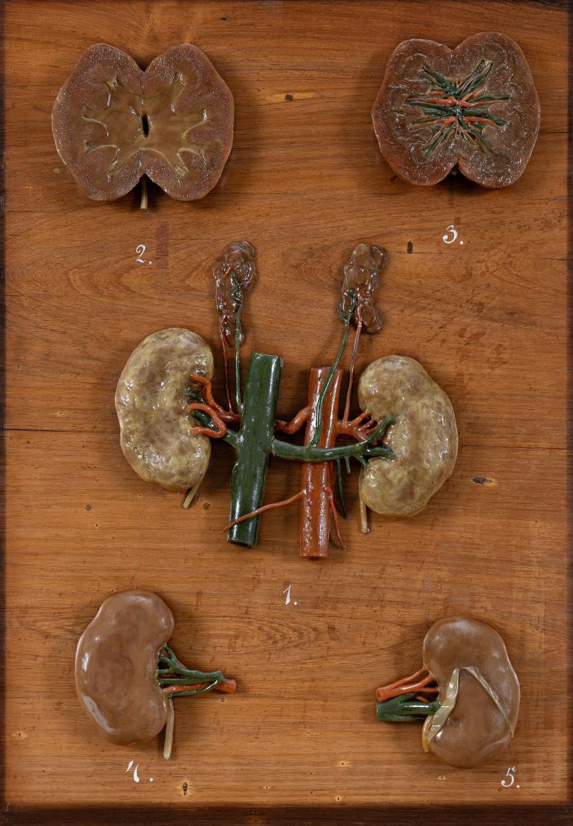 1. Isoliertes Modell der Nieren (Renes) und der Nebennieren (Glandulae suprarenales) mit ihren Gefäßen (Vasa renalia et vasa suprarenaia) sowie deren Anbindung an den Zufluss über die Hauptschlagader (Aorta) und an den Abfluss über die untere Hohlvene (Vena cava inferior – Achtung – hier gibt es einen korrekt dargestellten Seitenunterschied!). 2. Längsschnitt durch eine Niere (Ren) zur Darstellung der Nierenpyramiden und des Nierenbeckens (Pelvis renalis). 3. Längsschnitt durch eine Niere (Ren) zur Darstellung des Verlaufs der größeren Nierengefäße (Vasa renalia) im Niereninnern. 4. Die vordere Fläche der rechten Niere (Facies anterior renis dextri). 5. Die vordere Fläche der linken Niere (Facies anterior renis sinistri). Die Kapsel ist gespalten und teilweise abgehoben.