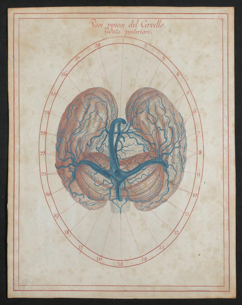 Oberflächliche Venen (Venae cerebri superiores) und ein Teil der Blutleiter des Gehirns (Sinus durae matris). Die Bildung des Zusammenflusses der eröffneten Blutleiter (Confluens sinuum) aus Sinus sagittalis superior, Sinus rectus und Sinus occipitalis sowie dessen Einmündung in den Sinus transversus sind deutlich erkennbar. Mittig über dem Balken (Corpus callosum) ist der Sinus sagittalis inferior sowie dessen Einmündung in den Sinus rectus dargestellt. Vergrößert dargestellt.
