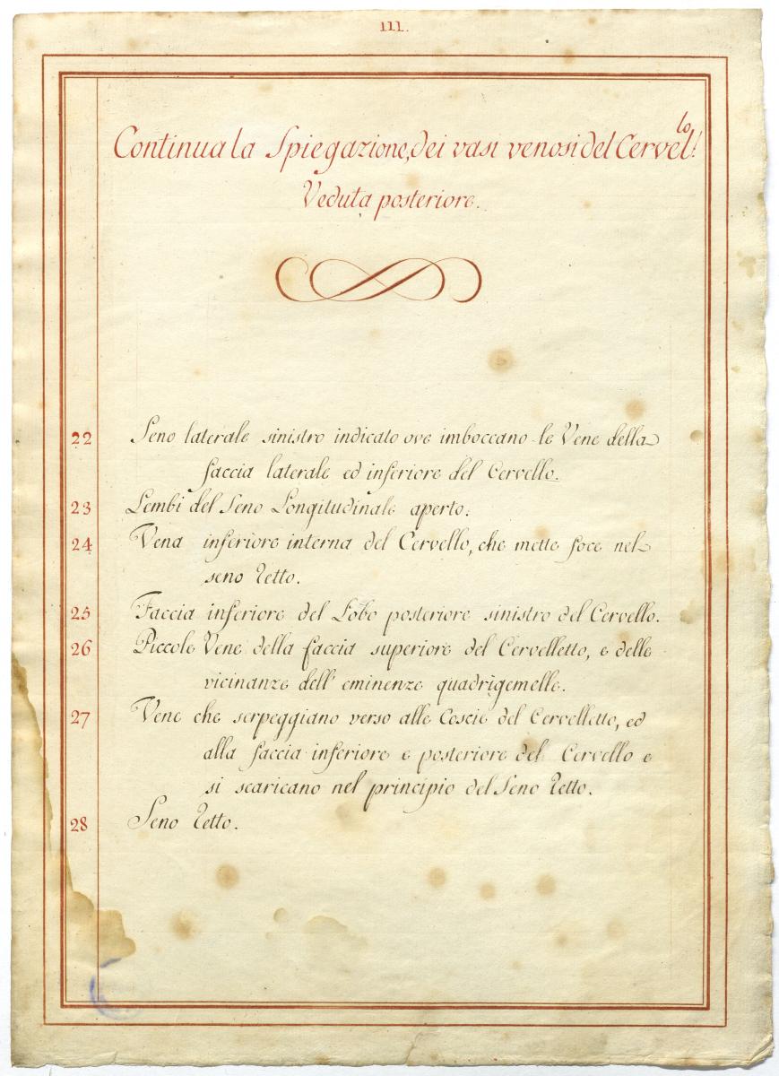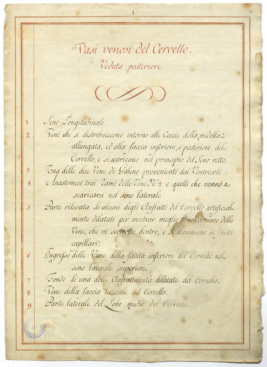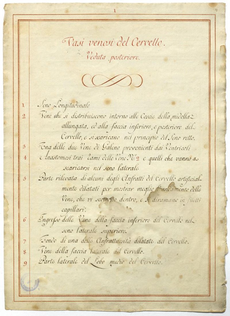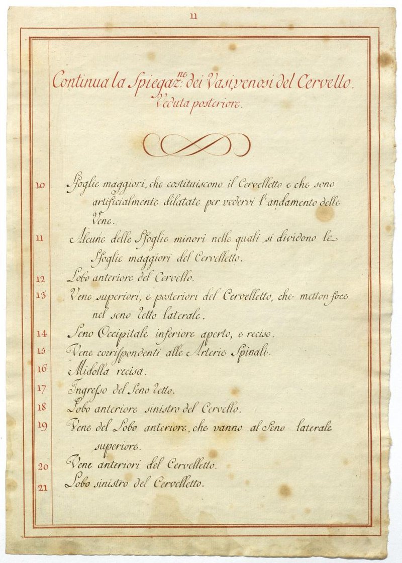Der Text ist die ergänzende Beschreibung in italienischer Sprache zum anatomischen Wachsmodell der Gehirnvenen.