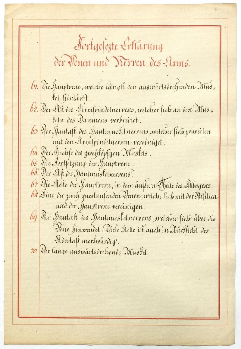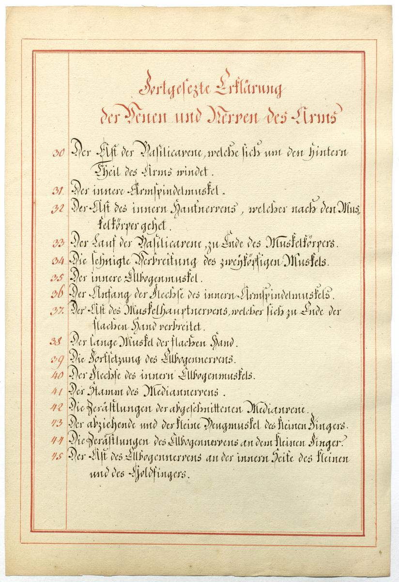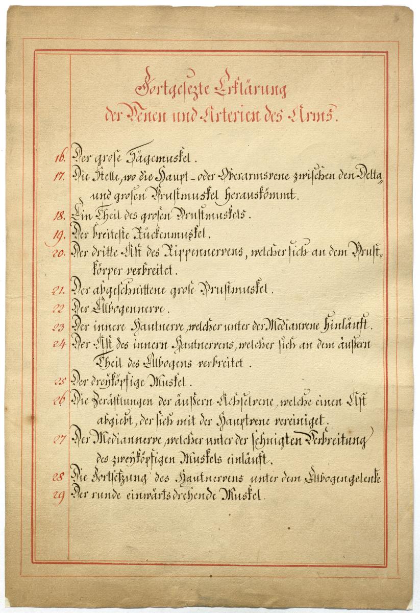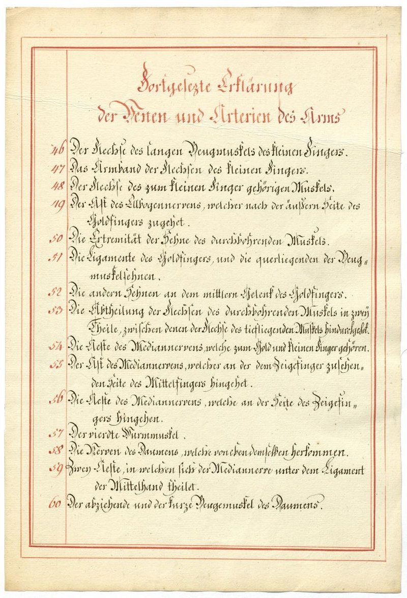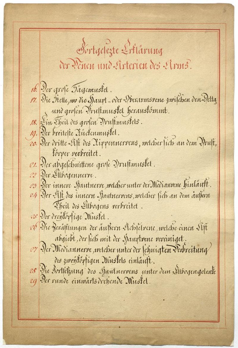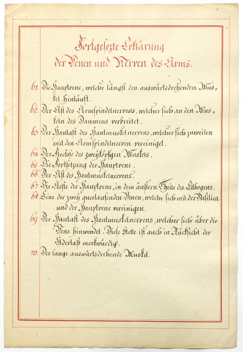 Der Text ist die ergänzende Beschreibung in deutscher Sprache zum anatomischen Wachsmodell der oberflächliche Leitungsbahnen des Armes. Blatt 1 fehlt.
