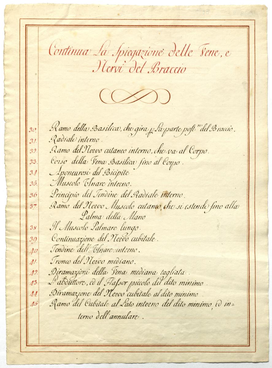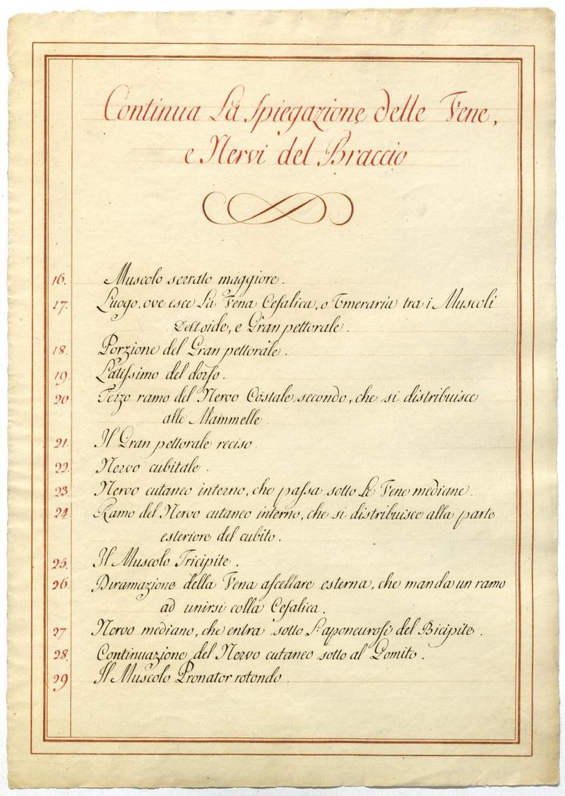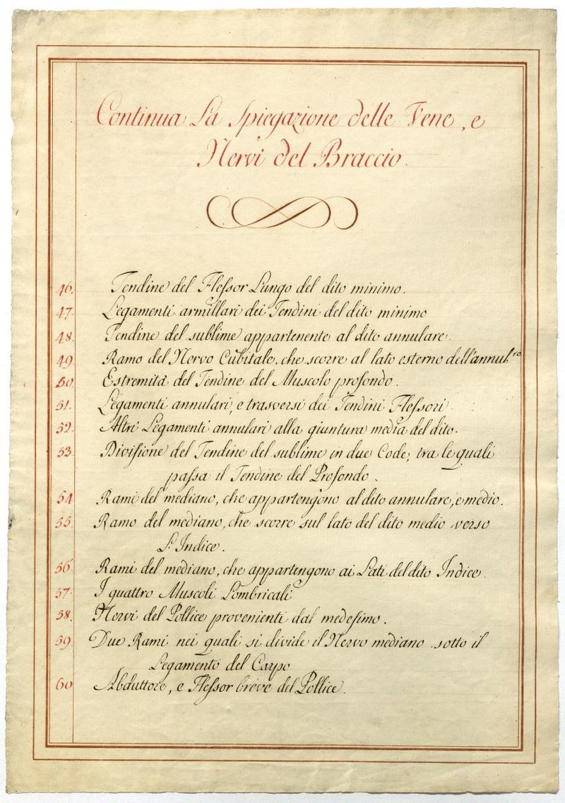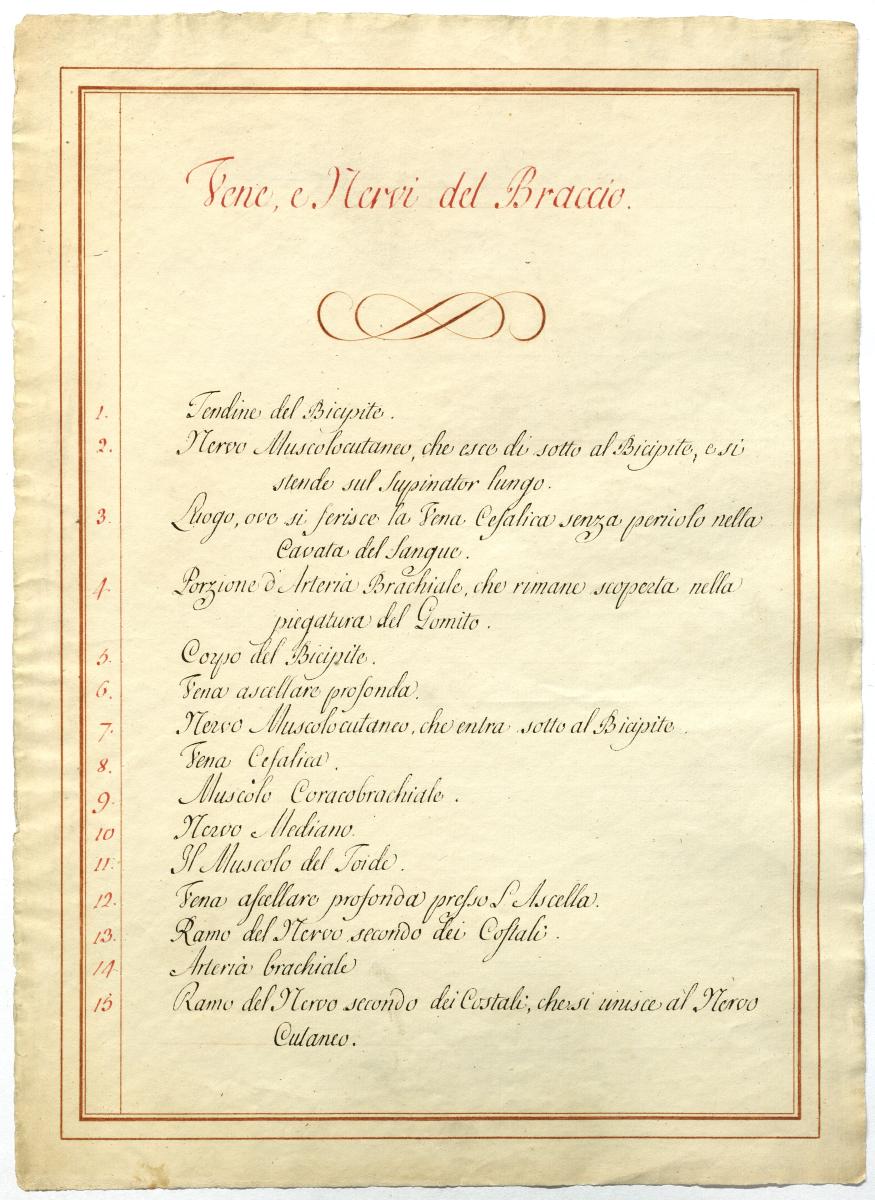 Der Text ist die ergänzende Beschreibung in italienischer Sprache zum anatomischen Wachsmodell der oberflächliche Leitungsbahnen des Armes. Blatt 5 fehlt.