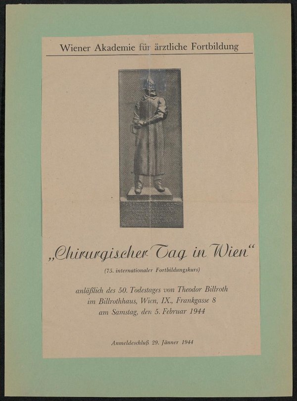 Der Druck ist einer unbekannten Zeitung entnommen worden. Vorlage für die Plakette war das von Michael Drobil entworfene Denkmal zu Ehren Billroths auf dem heutigen Gelände des Alten Allgemeinen Krankenhaus, Wien.