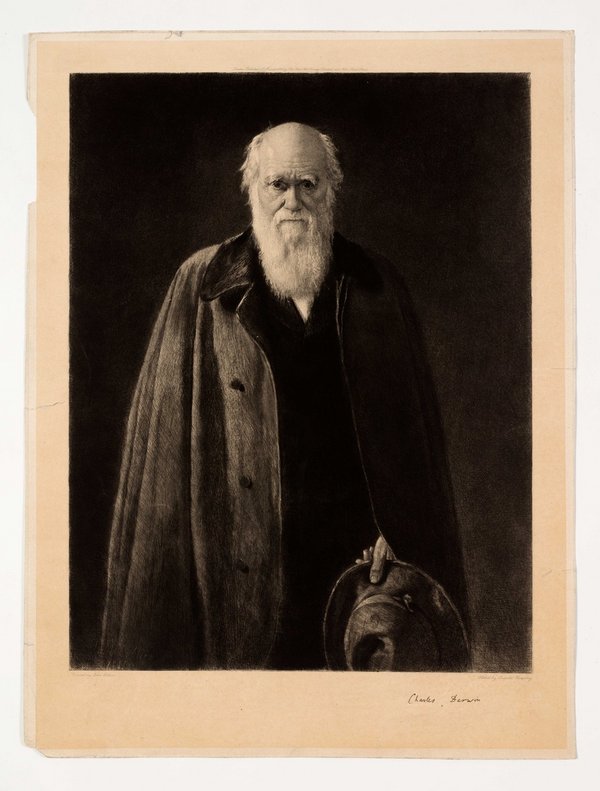 Lithografie von Leopold Flameng, nach einem Gemälde von John Collier. Druck durch The Fine Art Society London. Digitalisat von Reiner Riedler Neg I 206/11,12 siehe für Orginal-Gemälde: https://de.wikipedia.org/wiki/Charles_Darwin#/media/Datei:Charles_Darwin_portrain_by_John_Collier,_1883_copy.jpg