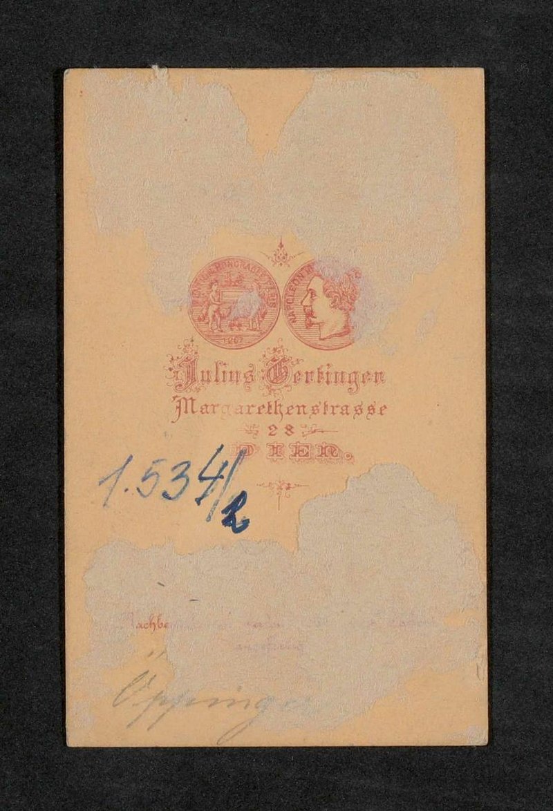 Die Fotografie wurde von Julius Gertinger, Wien, angefertigt. Mit Bleistift ist auf der Rückseite der fälschlicherweise als Eppinger gelesene tatsächliche Name Öppinger zu lesen.