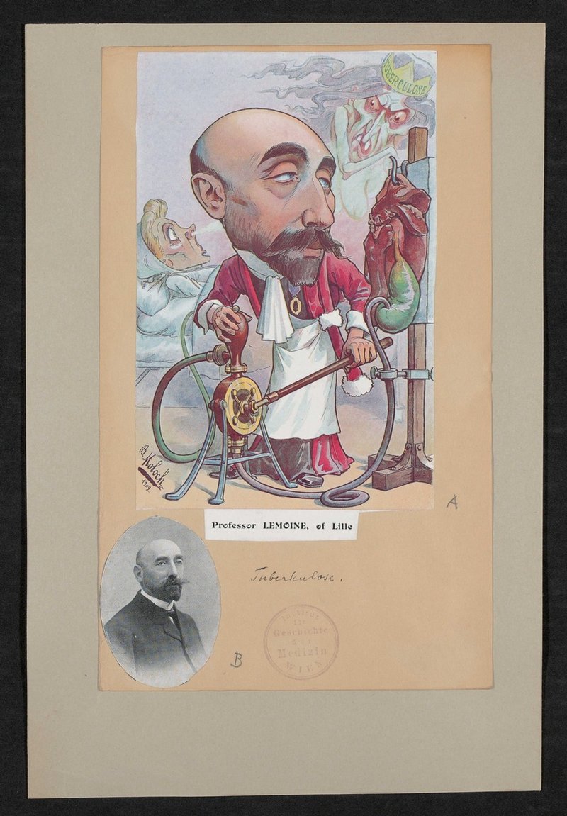 Die Karikatur ist von Alphonse Hector Colomb, genannt B. Moloch, angefertigt und in der französischsprachigen Zeitschrift Chanteclair, Mai 1909, veröffentlicht worden. Vorderseitig mit einem Stempel des Instituts für Geschichte der Medizin, Wien, versehen.