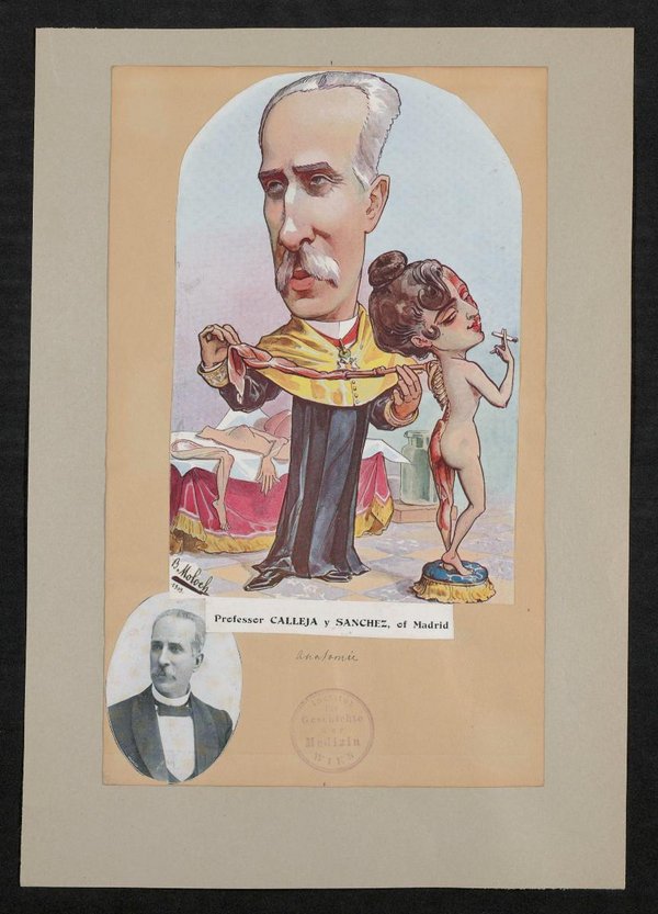 Die Karikatur wurde von B. Moloch, Pseudonym für Alphonse Hector Colomb, angefertigt und in der französischsprachigen Zeitschrift Chanteclair veröffentlicht. Vorderseitig mit einem Stempel des Instituts für Geschichte der Medizin, Wien, versehen.