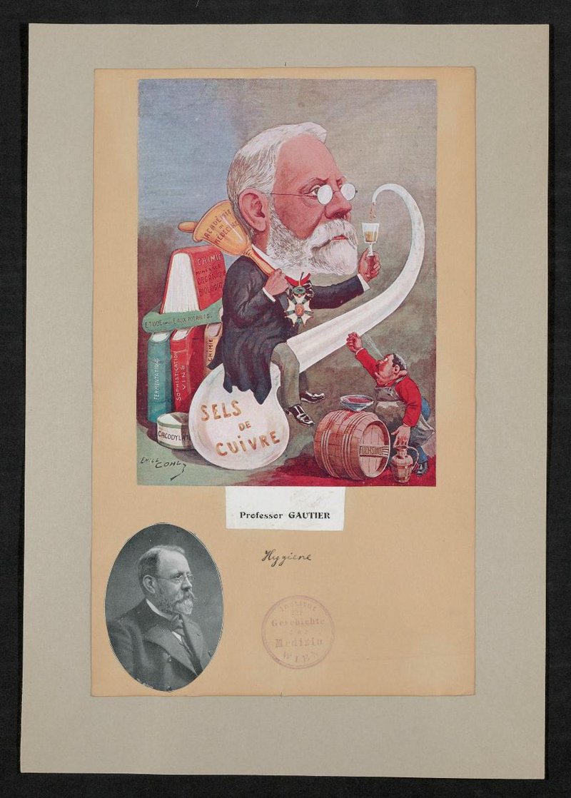 Ausschnitt aus einer unbekannten Ausgabe der französischsprachigen Zeitschrift Chanteclair. Die fotografische Vorlage wurde von Paul Berger, die Karikatur von Emile Cohl, Pseudonym für Émile Eugène Jean Louis Courtet, angefertigt. Vorderseitig mit einem Stempel des Instituts für Geschichte der Medizin, Wien, versehen.