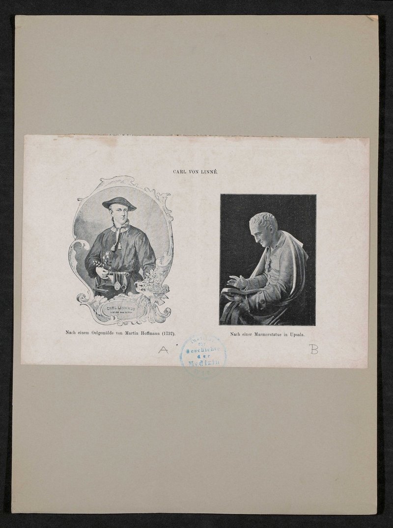 Das linke Bild basiert auf der Kopie eines Ölgemäldes von Martin Hoffmann aus dem Jahr 1737. Die Marmorstatue stand zum Zeitpunkt der Herstellung der Abbildung in Uppsala. Vorderseitig mit einem Stempel des Institutes für Geschichte der Medizin, Wien, versehen.