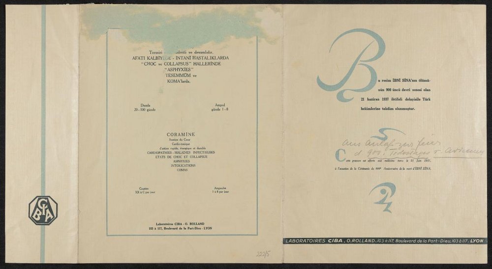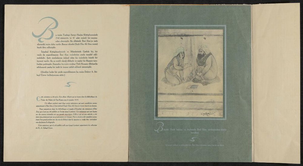 Das Bildnis befindet sich in einer Mappe, welche den türkischen Ärzten zum 900. Todestag von Avicenna überreicht wurde. Sammlung Dr. A. Süheyl Ünver.