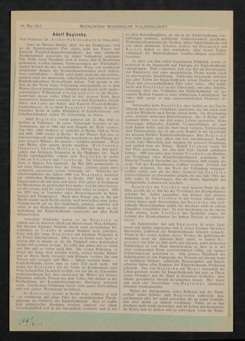 Auszug aus: Galerie hervorragender Ärzte und Naturforscher, in: Beilage zur Münchener medizinischen Wochenschrift, 1913, Bl. 320. Rückseitig befindet sich außerdem ein Beitrag von Arthur Schlossmann, Düsseldorf.