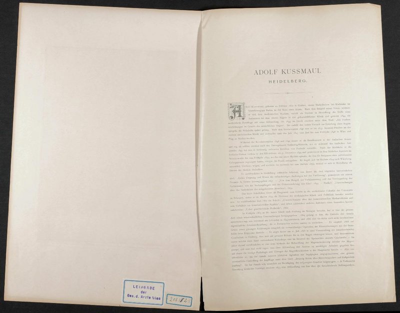 Die Lithografie wurde vom Adolf Eckstein Verlag, Berlin-Charlottenburg, gedruckt. Rückseitig befindet sich ein Stempel der Gesellschaft der Ärzte, Wien. An der Grafik ist ein Text zur Person Adolf Kussmaul befestigt. Neg I 179/3, 4