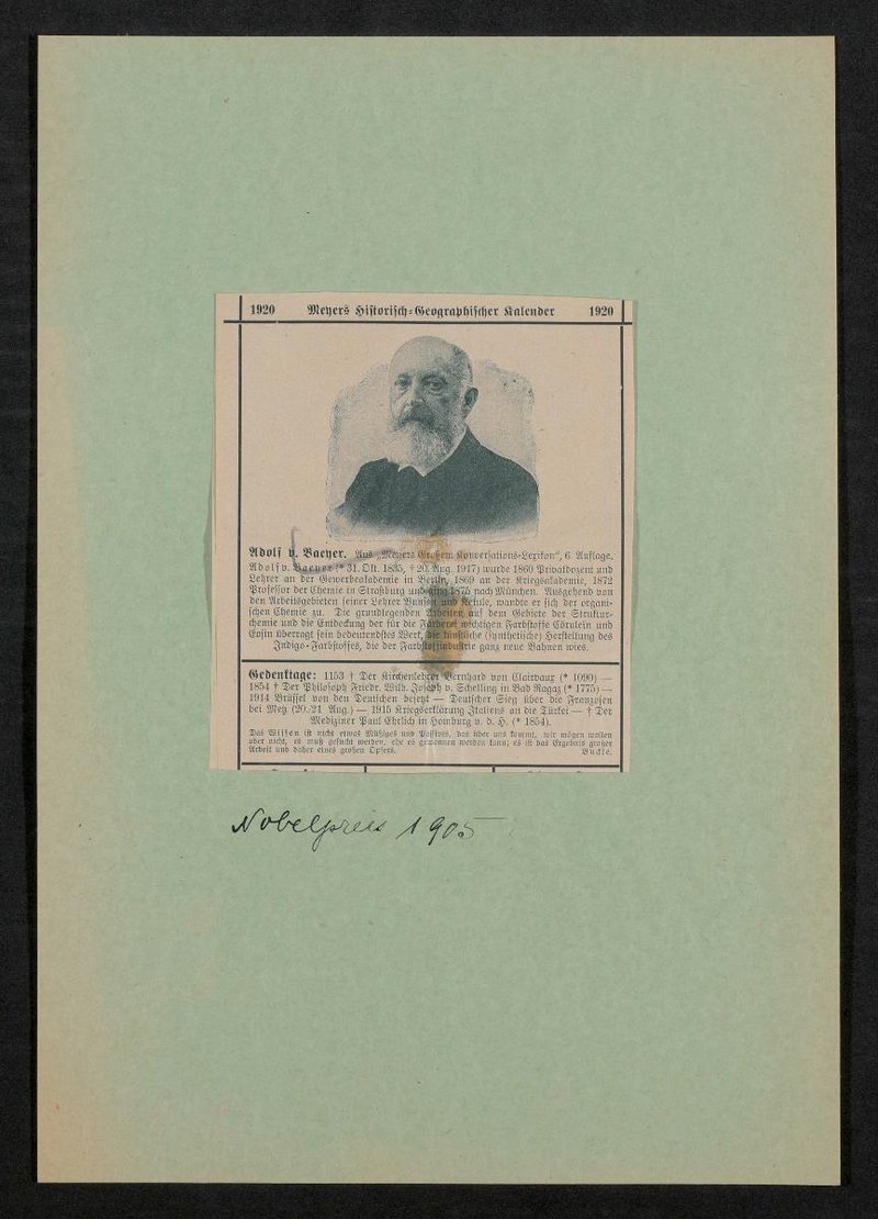 Ausschnitt aus: Meyers historisch-geographischer Kalender, Leipzig. Rückseitig befindet sich ein weiterer Bericht über die fachlichen Fertigkeiten aus dem Jahr 1905.