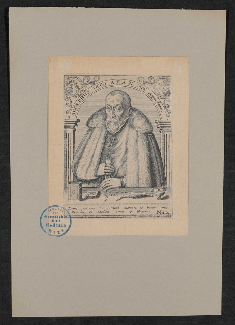 Kupferstich von Theodor de Bry, Frankfurt am Main, nach einem Gemälde von Abraham del Hel, Augsburg. Vorderseitig mit einem Stempel des Institutes für Geschichte der Medizin, Wien, versehen.