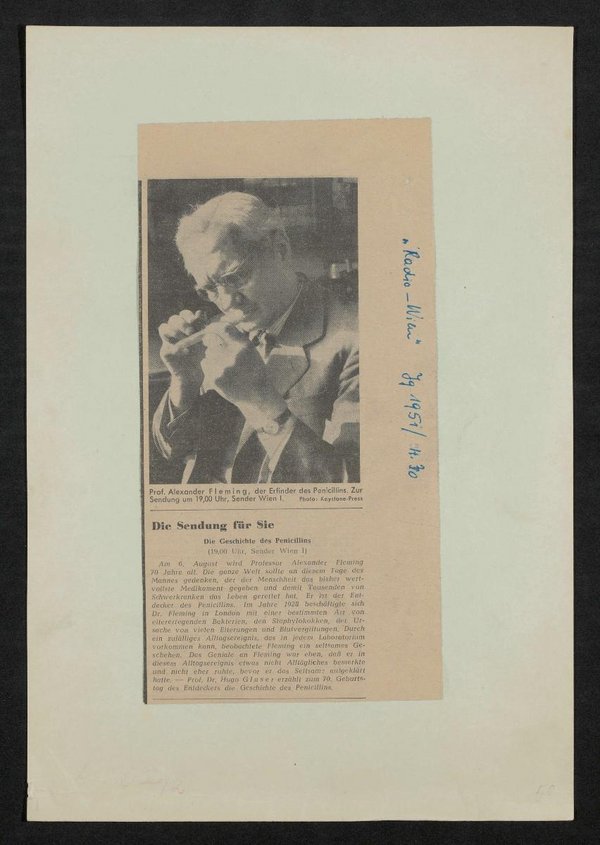 Ausschnitt aus: Radio Wien, Heft 30, 1951. Die Vorlage stammt von Keystone-Press. Das Bild ist Teil der Ankündigung einer Radiosendung zur Geschichte des Penicillins, erzählt von Hugo Glaser.