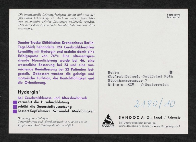 Porträt und Deckblatt sind auf einem Werbeprospekt für ein pharmazeutisches Produkt der Firma Sandoz AG, Basel, gedruckt worden. Als Adressat des Prospekts ist Gottfried Roth, Wien, angegeben.