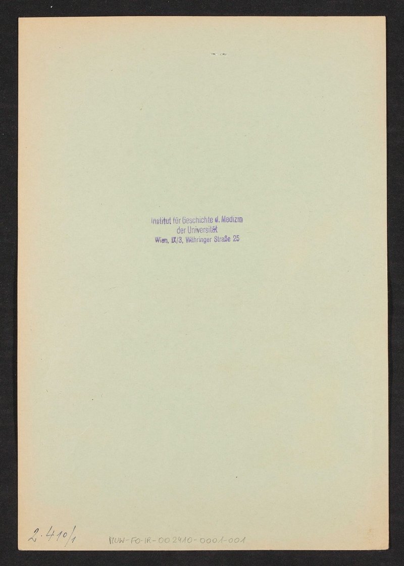 Die Fotografie wurde von einer Frau Brem im Anatomischen Institut Prag angefertigt. Auf der Rückseite der Fotografie befinden sich lebensgeschichtliche Informationen zum Abgebildeten sowie ein Stempel des Institutes für Geschichte der Medizin, Wien. Auf der Rückseite des Kartons mit einem weiteren Stempel des Institutes für Geschichte der Medizin, Wien, versehen.