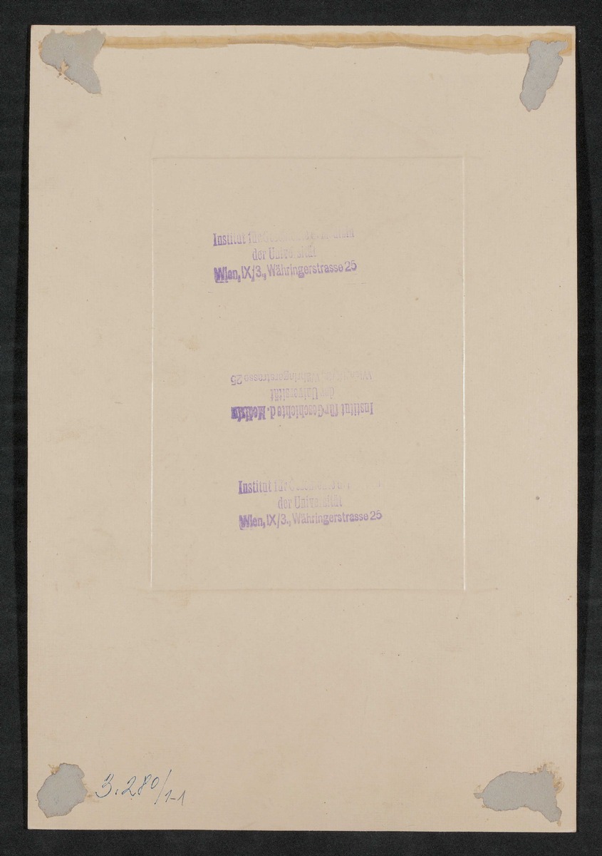Die Fotografie wurde von Max Schneider angefertigt. Auf der Vorderseite und der Rückseite befinden sich Stempel des Instituts für Geschichte der Medizin Wien.