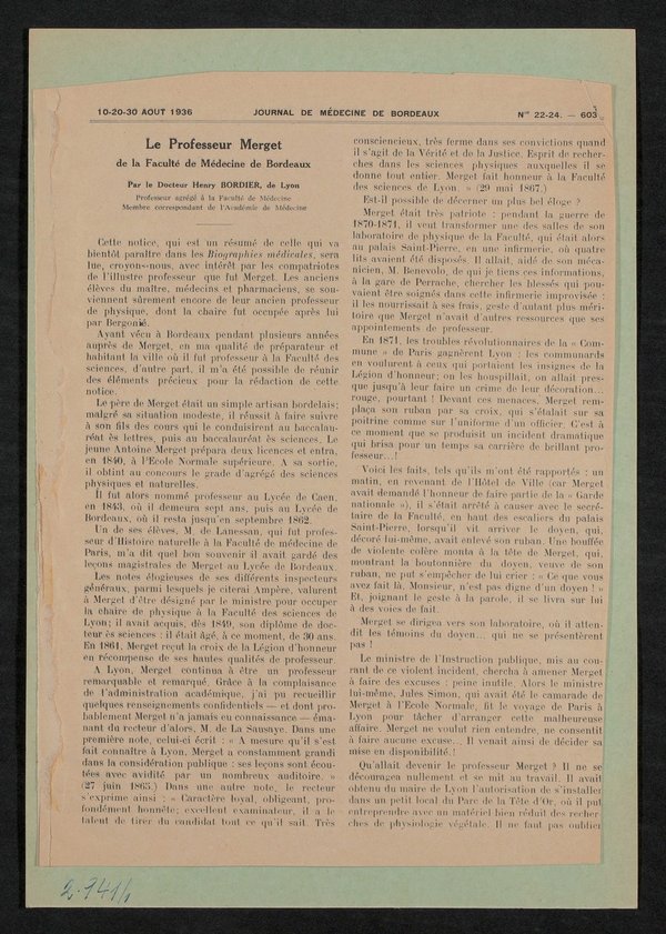 Bild und Bericht sind der französischsprachigen Fachzeitschrift Journal de Medecine de Bordeaux, Nr. 22-24, 10., 20. und 30. August 1936, S. 590, S. 603-605.